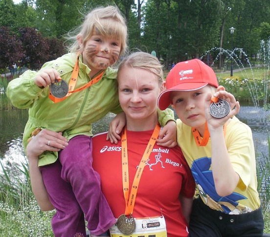 Uważam, że dystanse jakie dzieci miały do pokonania były zbyt duże, powinni biec połowę. Paweł (8lat) miał przebiec 2 kółka po 400m na bieżni. A Emi (5lat) miała przebiec 1 kółko. Jednakże dali radę. Dobiegli do mety i dostali piękne medale. Zawsze po moich biegach zabierali moje i się kłócili kto przez 5 minut ma nosić. Teraz każde z nich ma swój i chodz± w nich po domu.