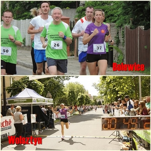 Start w Wolsztynie – rozglądam się dookoła szukając osoby, która biegłaby na podobny do mojego czas. Na pewno się kogoś uczepię. Nie muszę długo czekać. 200m po starcie dobiega do mnie znajomy z Opalenicy. Biegniemy razem. Jak dobrze! Właśnie tego potrzebowałam. Obecności drugiej osoby i to „mojego pokroju”, nie kogoś, kto zwykle biega dyszkę w 40 minut a dziś zamierza zrobić to wolniej. Chciałam mieć kogoś, dla kogo te 49 minut też będzie wyzwaniem, niełatwą walką. I tak też się stało. Pierwszy km 4:40… Obiecująco, choć i tak wiem, że nie utrzymam tego do końca. Mimo to nie poddaję się w walce. Pilnuję oddechu, prostej postawy, staram się biec „po wewnętrznej”. Dziękuję kibicom skinieniem głowy lub przez podniesienie kciuka. Macham do fotografów. Samopoczucie OK, ale czuję tę presję wyniku. Chcę go zrobić. Po połówce tata krzyczy mi, że jest dobrze. Widzę na zegarku 50sekundowy zapas czasu na 50 min. Wystarczy utrzymać 5 min/km i „sukces gwarantowany”. Niestety chwilę po szóstym kilometrze Tomek powiedział do mnie „powodzenia” i zaczął zwalniać… Krzyknęłam „NIE!”, ale na nic się to nie zdało. Nie słyszałam już jego oddechu. Zostałam sama. A tego właśnie nie chciałam. A to nie mogło się zdarzyć. A to pozbawiło mnie motywacji. Biegnąc z nim, czułam się w pewien sposób ‘potrzebna’. A teraz? Muszę sama pokonać 4 km do mety. Było oczywiście wokół mnie pełno ludzi, ale z żadną z doganianych osób nie potrafiłam znaleźć wspólnego rytmu. Koniec. Czułam, że zwolniłam i odczuły to też moje nogi, które koniecznie chciały iść do przodu, ale reszta ciała je hamowała. Na szczęście głowa była na tyle silna, zdeterminowana i zmotywowana, że udało mi się dotrzymać do mety w miarę równe tempo.