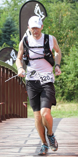 Nie miałem sił, usłyszałem coś za sobą i odwróciłem się, gdzieś w oddali zobaczyłem ciemną postać... w taki to sposób poznałem Krzysztofa, z którym przebyłem ostatnie 20 kilometrów. Wybraliśmy wspólne bieganie, przez moment poczułem jeszcze jakąś energię w sobie i pokonywaliśmy kolejne kilometry. Jednak to były już ostatnie podrygi mojego biegania, pod górę już nawet nie szedłem. Wiele podejść obserwowałem przewieszony przez kije, a Krzysiek leciał gdzieś kilka kroków przede mną. Słabłem, a do tego cały czas prowadziłem walkę ze swoimi wnętrznościami, z góry skazany na porażkę.