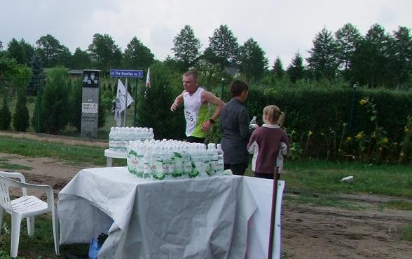 Nawrotka – jak zwykle – w Smogorzewcu na ul. The Beatles 2. Każdy ma tu mieć robione zdjęcie(p. fotka). Będzie fajna pamiątka. Niestety woda dawana tutaj jest w butelkach. Szkoda sił na odkręcanie nakrętki i dźwiganie butelki (mimo, że tylko 0.5 l). Poza tym szkoda marnować napoju robiąc tylko parę łyków (prawie pełne butelki leżały na poboczu trasy, więc wielu zawodnikom to nie pasowało). Woda z kubków byłaby lepszym rozwiązaniem. Nie piję więc. A szkoda, bo współzawodnictwo po półmetku z młodszym ode mnie biegaczem (raz on, raz ja i w końcu na ostatniej prostej on) wycisnęło ze mnie wszystkie soki.