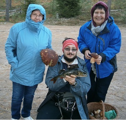 Wróciliśmy na kamping i po obiedzie ruszyliśmy samochodem „na ryby”- wybierając inne jezioro, położone przynajmniej częściowo w lesie, który tłumił wiatr. Po zjechaniu z głównej drogi ciocia podniosła krzyk: „Stop. Grzyby”. Przez okno samochodu wypatrzyła kilka przepięknych kozaków. Po zatrzymaniu samochodu ruszyła po nie pędem i już kilka chwil później prezentowała dumnie swoją zdobycz. Dawno nie widziałem nikogo tak uradowanego. Dojechaliśmy do leśnego parkingu i nastąpił tradycyjny podział: Panie na prawo, panowie na lewo. Tylko tym razem powód był inny: mama i ciocia zainteresowane były grzybami, a my z ojcem wyruszyliśmy na poszukiwanie ryb. Niestety przynęty nam się rwały, jedna po drugiej a wymarzonej „takiej ryby” nie było. Dopiero po pewnym czasie na haczyk nabił mi się miniaturowy szczupak. Niestety prawdopodobnie chciał się „tylko przyjrzeć przynęcie” lub chybił atak, bo kotwiczka tkwiła mu w okolicach oka. Delikatne wyciągnięcie nie było możliwe i rybę trzeba było dobić. Po kilku kolejnych straconych przynętach postanowiliśmy wracać. Ojciec szybciej, a ja wolniej od czasu do czasu rzucając spośród drzew niewielkim woblerem (imitacja rybki). Po jednym z rzutów woda zakotłowała się, a ja wyciągnąłem dużego, 45 centymetrowego okonia. Rzuciłem jeszcze kilka razy – tym razem już bez takiego rezultatu. Wróciłem do samochodu i po krótkiej sesji fotograficznej z naszą zdobyczą (grzyby i ryby) wróciliśmy do domku. Kolacja, oczyszczenie grzybów i ryby zajęły nam sporo czasu. W konsekwencji na umówionego robra lub dwa w brydża już nie starczyło nam sił. Rodzice i ciocia już śpią, a ja powoli kończę „sprawozdanie”. Jutro kolejny dzień nad pięknymi jeziorami. Może pogoda będzie lepsza i da się wędkować z łodzi?