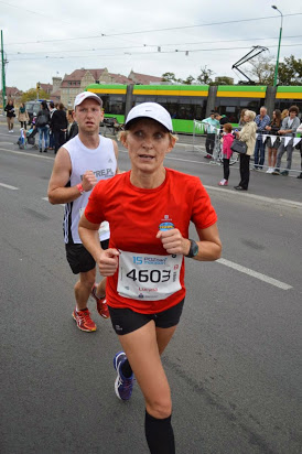 Start w maratonie poznańskim w miniony weekend uznam za mało udany. Zawaliłam na podbiegach, cóż kłania się siła biegowa i podbiegi.Muszę to koniecznie poprawić. Ogólnie biegło mi się dobrze ,mogę nawet śmiało powiedzieć ,,na zapasie sił,, a tylko do 28 km. Póżniej czułam po nogach ciężkość ,moje tempo było już nierówne. Na dodatek biegłam już sama.Starałam się utrzymywać równe tempo ,lecz profil trasy utrudniał to .Na 35 km wiedziałam już ,że nie zejdę poniżej 3.20,lecz nowa życiówka będzie na pewno. Z każdym kilometrem bliżej do mety wymijałam sporo ludzi .Widziałam jak niektórzy zmagają się ze skurczami ,niektórzy szli. Ja po cichu sama byłam trochę spanikowana .Moją głowę zaprzątała myśl czy dopadną mnie skurcze. Miałam dwa ukłucia w dwugłowe, na szczęście nie przeszkodziły mi w dalszym biegu.Ale niepewność pozostała do ostatnich metrów.Szczególnie gdy na ostatnim kilometrze przyspieszyłam , bo zobaczyłam dwie kobietki przede mną. Udało mi się je dogonić i z pełnym luzikiem wbiec na metę. Maraton ukończyłam w dobrej kondycji.Zajęłam w nim 596 ogólnie ,28 wśród kobiet i 3 miejsce w kat.40. Niestety organizator nie pomyślał o nagrodach dla zwycięzców w kategoriach.Dało mi to do myślenie. Moja decyzja . Przestaje biegać przez najbliższy czas maratony. ,,Gra niewarta świeczki,,.W sumie mam ukończone już 6 maratonów ,to na jakiś czas wystarczy .Nowa życiówka też na jakiś czas powinna wystarczyć 3.23.24.