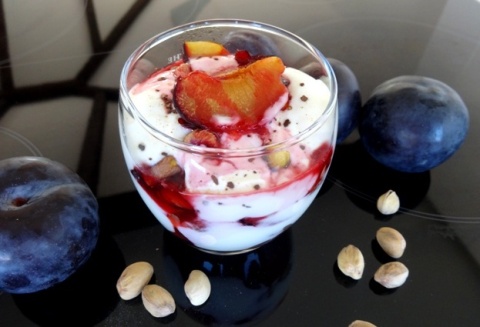 ¦liwki kroje na cztery czę¶ci, układam w naczyniu żaroodpornym, delikatnie podlewam wod± (by nie przywarły do dna) i piekę w temperaturze 160 st przez 20 minut. Pistacje obieram z łupinek i prażę na patelni. Układam warstwami w salaterce ¶liwki, pistacje, jogurt. Polewam sokiem powstałym podczas pieczenia. Na koniec szczypta cynamonu i może łyżeczka płynnego miodu. Pycha!