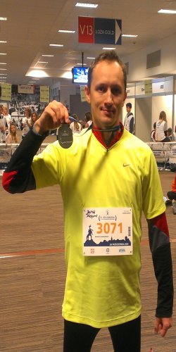 Po przekroczeniu linii mety czekał już na mnie medal. Piękny i unikalny. Ostatnio organizatorzy różnych biegów naprawdę starają się urozmaicić te pamiątki w bardzo umiejętny sposób. Medal na szyi, pora na regenerację. Szybkie zarzucenie na siebie folii termicznej i już jestem przy napojach i bananach. Wszystko szło sprawnie, co przy tamtej temperaturze miało niebagatelne znaczenie. Tego dnia po raz pierwszy po jakimkolwiek biegu skorzystałem z masaży. Nie spieszyło mi się nigdzie. Poczekałem kilka minut i już mogłem poddać się rozluźniającemu masażowi. Organizator postarał się o dużą liczbę masażystów i stołów, dzięki czemu nie trzeba było długo czekać. Trochę gorzej było z ciepłym posiłkiem. Tu kolejka była spora i nieregularna, a namiotów wydających jedzenie relatywnie mało. Dostanie się do swojej porcji makaronu zajęło mi 15 minut, ale na szczęście folia termiczna nie pozwoliła mi zamarznąć :) Zjeść można już było wewnątrz budynku w ciepłym pomieszczeniu. Potem już tylko depozyt, pamiątkowe zdjęcia i prysznic w szatni zawodników Wisły Kraków. Niebanalnie :) Stadion opuszczałem jako jedna z ostatnich osób. Bez pośpiechu ogarnąłem się po biegu, zjadłem, odświeżyłem, chciałem czerpać atmosferę tej imprezy do samego końca. I udało mi się to. A atmosfera była bardzo fajna, mimo niesprzyjającej aury. Mam nadzieję, że ten półmaraton na stałe wpisze się w kalendarz krakowskich imprez i będę mógł co roku kończyć biegowy sezon "na własnym terenie"!