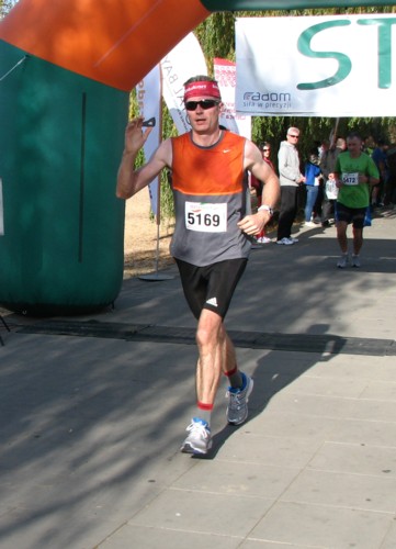 Ja niestety jestem chory, i przystępuję do biegu z temperaturą 37,5st. C. Postanawiam biec, aby zakończyć swój projekt Cztery maratony na czterdzieści lat. Start. Ruszamy. Chociaż to koniec października, temperatura jest ponad 20 stopni, dojdzie do dwudziestu kilku stopni, pełne słońce. Pogoda super ale dla kibiców, nie maratończyków. Biegnie się mi nieźle, okrążenia szybko mijają, nawet nie jest to takie nudne, trafiają się ciekawi, mocno dopingujący kibice. Biegnę ostrożnie, spokojnie, sporą część dystansu pokonuję z Wiesławem, biegaczem z Annopola, ale niestety słabnie i zostaje. Pod koniec przyspieszam, nowością jest dla mnie dublowanie bardzo wolno biegnących na kolejnych kółkach, normalnie nie ogląda się tych, co z tyłu. Ostatnie metry, wpadam na metę. Staje. Pewne zaskoczenie, że już skończyłem u dziewczyn dających medale … ;-) Wiesław z Annopola z którym wcześniej biegłem, a któremu zostało chyba jeszcze kółko odwraca się i bije mi brawo… Jest mi miło. Czas 3:16:56 netto, oceniam jako niezły jak na te warunki, trasę i moje zdrowie (nota bene po tym biegu po chorobie nie było już śladu, pewnie wirus został spalony w czasie jego trwania). Jestem 11 na 146 kończących ten maraton biegaczy.