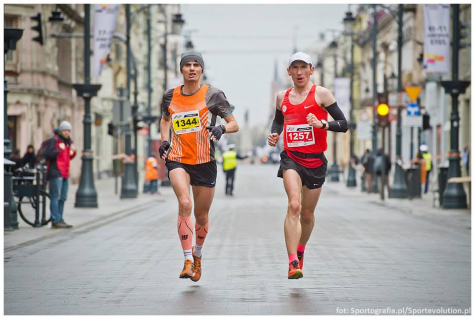 Ja zacząłem w tempie 3:30/km i miałem tylko jednego towarzysza Szymona Knoblocha. Szymon mówił że ma cel 2:35, ale postanowił zacząć razem ze mną. Biegliśmy więc razem. Pierwsza piątka wyszła super 17:28, więc nawet trochę za szybko. Biegło się komfortowo. Na drugiej piątce było trochę wolniej. Trasa była bardziej kręta, zanim dobiegliśmy do ulicy Piotrkowskiej asfalt był marnej jakości i dwie długie proste pod wiatr. Czasowo wyszło 17:40, czyli świetnie. Około 13 kilometra zacząłem odczuwać lekkie zmęczenie, wziąłem pierwszy żel. Kolejna piątka 17:43. Zaczęło mi znowu lekko biec. Zaczęliśmy się zmieniać na prowadzeniu z Szymonem bo do 15-stego kilometra biegliśmy obok siebie. Mimo, że wydawało mi się, że biegniemy szybko kolejna piątka wyszła wolno bo 17:57. Półmetek przekroczyliśmy z wynikiem 1:14.40. Już wiedziałem, że będzie ciężko połamać 2:30, ale trzeba było walczyć. Na 23 kilometrze wyprzedziliśmy pierwszą kobietę z elity, więc dość szybko odrobiliśmy 18 minut:). Na 24 kilometrze wyprzedziliśmy kolejną, tym razem Kenijkę. Wziąłem drugi żel. Niestety Szymon został w tyle przed 25 kilometrem. Teraz już musiałem walczyć samotnie. Ta piątka była bardzo ciężka, bo było ciągle pod wiatr, a ten wiał tu dość mocno. Czas wyszedł dość słaby bo 17:58. Około 26 kilometra był na szczęście nawrót i dostałem wiatr w plecy. Było lżej, ale pod górkę:) Biegłem teraz 4-pasmową jezdnią. Kilka kilometrów samotnie, żadnego kibica, żadnego biegacza przede mną. Tylko ja, moje coraz większe zmęczenie i 4 pasmowa jezdnia tylko dla mnie! Mimo wiatru w plecy nie wiele mi się udało przyspieszyć. Piątka między 25 a 30 kilometrem wyszła w 17:55. Wymarzone 2:30 zaczęło się mocno oddalać, ale nie było tragedii, wynik i tak jak na te warunki był dobry. Minąłem Atlas Arenę. Wiedziałem, że teraz muszę ją jeszcze 2 razy okrążyć. Wyprzedziłem kolejne kobiety, ale już miałem mocną bombę. W międzyczasie wziąłem ostatni żel. Wodę piłem od początku w małych ilościach na każdym punkcie. Kolejna piątka była już bardzo wolna - 18:37. Nogi były już tak ciężkie, że nie mogłem się zmusić do szybszego biegu. Walczyłem do końca aby wynik był jak najlepszy. Piątka między 35 a 40 kilometrem wyszła 18:46. Zebrałem się na ostatnich dwóch kilometrach do długiego finiszu i wbiegłem na metę w Atlas Arenie z wynikiem 2:32.22. Meta była super. Głośna muzyka, kibice, kolorowe światła, lasery. Wrażenie ekstra!