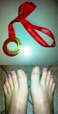 W piątek 2 dni przed maratonem spakowałem się i pełen obaw o nogę lewą pojechałem autem ze znajomym w sobotę rano do Warszawy. W tym samym dniu spotkałem się pierwszy raz z Jackiem w Złotych Tarasach, którego już bardzo dobrze zdążyłem poznać podczas naszej burzliwej codziennej korespondencji mailowej i telefonicznej. Pociągiem SKM miejskim podjechaliśmy później do miasteczka biegowego po odbiór pakietów startowych i następnie do miejsca, gdzie mieliśmy przenoclegować. Noc przespałem niezbyt ciekawie. Pierwsze trzy godziny ok twardy sen. Niestety przebudziłem się i reszta nocy to takie dogorywanie do rana. Co nie przysporzyło mi niestety witalności. O 7 rano ubieranie się w strój biegowy, śniadanie, 2 kapsułki z ibupromem i ruszyliśmy o 8.00 pociągiem miejskim w stronę stadionu narodowego. Po przybyciu na miejsce ilość ludzi robiła ogromne wrażenie. W sumie pierwszy raz widziałem taką masę ludzi około kilkunastu tysięcy biegaczy. Oddałem rzeczy do depozytu i zaczęliśmy małą rozgrzewkę, ćwiczenia rozciągające i skierowaliśmy się do swojej strefy czasowej. Ja do strefy 3:45. W trakcie zaliczyłem jeszcze wspólnie wykonywane ćwiczenia rozciągające o 9.30 wystrzał i ruszył bieg. Po około 3 minutach minęliśmy bramkę startową i ruszyłem z tłumem na 42 km szlak uliczny. Starałem się utrzymywać tempo zająca nie szarżować, o czym ostrzegał mnie Jacek. Do 8-9 km biegło się dobrze. Na podbiegu kiedy był skręt o 90 stopni niefortunnie stanąłem lewą nogą na krawężniku, noga ześlizgnęła się na mokrym chodniku i poczułem lekki ból z tyłu lewej nogi. Dodatkowo na podbiegu zające z tyłu miarowo zaczęli przyspieszać doganiając pierwszego zająca z flagą 3:45:00. Ból niby minął, ale około 15 km nagle poczułem ten sam przeszywający ból rwy kulszowej co w styczniu. No to nauczony radzenia sobie z dolegliwością automatycznie zwolniłem, aby ją rozruszać i rozmasować. Widok oddalających się zająców z chorągiewkami 3:45:00 oj jak to bolało i to bardzo. W pewnym momencie przeszedłem w marsz zacząłem masować nogę. Po 100 m kontynuowałem bieg. Kiedy jeden z biegaczy klepnął mnie w plecy i powiedział nie poddajemy się biegniemy. Nie wiedział co mi dolega, pewnie myślał że to zadyszka, a mi nie chciało się mówić, bo już byłem lekko podłamany. I tak biegłem do 21 km. Z każdym kilometrem było coraz gorzej rwy kulszowej nie potrafiłem rozchodzić i bieg był kontynuowany 100 metrów chodu i masażu mięśni uda i 3 km biegu z czego lewa noga była praktycznie przetaczana. Na 37 km minęli mnie zające z chorągiewkami 4:00:00. Starałem się ich trzymać do 40 km. Niestety na 40 km doświadczyłem kolejnego ataku rwy, która już tak szalała, że mięśnie z tyłu łydki i uda zrobiły się twarde jak beton i dodatkowo mięśnie zaczęły wykręcać się i robić coś w rodzaju świdra. Ból był nie do opisania, ale ani przez moment nie myślałem o zejściu z trasy. Kiedy praktycznie dochodziłem do mety ostatnie 300 m i wysiliłem się na przytruchtanie ostatnich 200 m do mety cieszyłem się, że koszmar się zakończył. Czas netto 4:05:13. Medal odebrałem. Podczas brania prysznica i zdejmowania butów oraz skarpet doświadczyłem kolejnego smutnego odkrycia. Nie obciąłem na krótko paznokci u nóg, no i efekt był taki jak na zdjęciu. Dobrze, że nie czułem tego na trasie biegu :) Tak więc debiut nie wyszedł zbyt okazale.