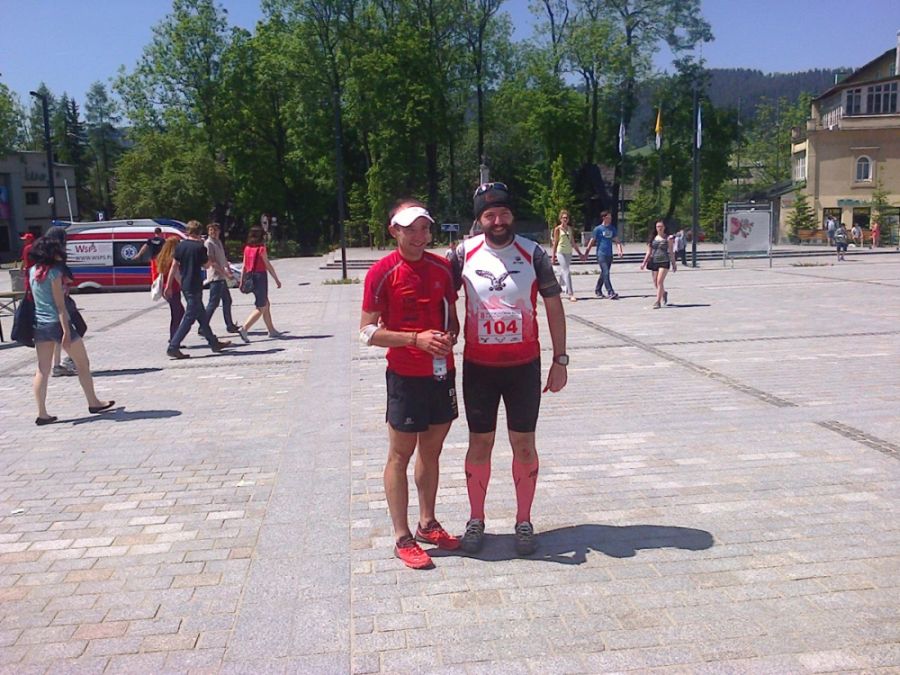 Piątek, Bieg Sokoła. Dzień zapowiadał się przepięknie. Od kilu dni aura słoneczna. Oczywiście z lekką przerwą na Boże Ciało. Zachmurzone niebo postraszyło, ale nie padało. Bieg zaczynał się w Kuźnicach, potem Kalatówki, Ścieszka nad Reglami, Dolina Białego, Ścieżka pod Reglami, Dolina Strążyska, Ścieżka nad Reglami, Kalatówki Kuźnice. 17,4km +1013/-1013m. Trasa znana, już trzeci raz będę mierzy się z nią; oczywiście oprócz zbiegu. Ale na luzie bo najważniejsze starcie to dopiero jutro. Tak więc spokojne rozpoczęcie. Na pierwszym zbiegu do Doliny Białego widzę rycerza podtrzymywanego przez Anioła Stróża (Ratownika Medycznego). Skręcona kostka. Aniołów Stróżów na trasie trochę było. I dzięki im za to. W Dolinie Białego punkt kontrolny obstawiony przez Marcina Świerca. Super przybić piątkę z mistrzem. Następnie wspinamy się na przez dolinę Strążyską na Regle i Kalatówki. Tutaj ciężko. Nie wziąłem żadnego żelu. Odcina mi prąd powoli na szczycie. Jeszcze zbieg. Na zakręcie z Kalatówek w stronę Kuźnic dostaję taki doping jak zwycięzca. To dodaje skrzydeł. Po tych kamulcach z Kalatówek czuje się jak na rodeo. Krzyczę co jakiś czas do turystów o puszczenie lewą stroną. Mogę się nie zatrzymać w miejscu. Kolana dostają swoje. Ostatnie metry na pełnym biegu. Córki krzyczą TATA. Meta. Wynik 2:17:33. Nieźle zważywszy, że trasa troszkę wydłużona. Kolega Kamil z Fudu&Co. skończył 7min wcześniej. Odpoczynek, rozciąganie, BCAA polecone przez dh Leszka. No to do biura zawodów na dalsze rozdawanie numerów.
