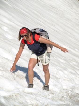 Zaniepokojony początkowo Jarek, na wieść o tym, co mi się przytrafiło, oświadczył, że w takim razie na obiad będzie mi przysługiwał jeden kawałek mięsa mniej. W końcu pokonujemy próg i oczywiście natykamy się na polodowcowe jeziorko - Radsee. Za nim szlak pnie się po skałach przetykanych śnieżnymi płatami, czyli mam to, na brak czego narzekałam w poprzednim poście :) Jest więc i adrenalinka, zwłaszcza, że nie mam kijków, by się asekurować... Włażę, jak umiem, trochę podpierając się rękami, trochę nosem. I co widzę? Na śniegu, na wysokości ponad 2600 m n.p.m. siedzi kolorowy motyl! Ciekawe, co mu przyszło do głowy? Motyl-turysta? Korzysta jak umie ze swojego krótkiego, motylego życia? :) Nie, nie zrobiłam mu zdjęcia. Byłam zajęta wczołgiwaniem się po śniegu, musicie mi uwierzyć na słowo - naprawdę tam był!