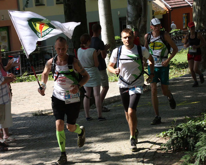 10.. 9... 8... ..2.. 1... Start! Ruszamy spokojnie. Temperatura przyjemna, widno, zielono w około, tempo komfortowe.. Czego chcieć więcej. Trasa oznakowana jest idealnie, tego się w sumie nie spodziewaliśmy. Bardzo miłe zaskoczenie. Znaki namalowane na ziemi, taśmy i tabliczki rozwieszone w newralgicznych punktach trasy dają niesamowity komfort zajęcia się tylko istotą tego wydarzenia czyli bieganiem. Niestety pomimo tak świetnie oznakowanej trasy, kompletnie rozluźnieni i pochłonięci dyskusją w pewnym momencie na chwile zbaczamy ze szlaku :). Na szczęście szybko się orientujemy i nadrabiamy może 800m.. Po tym fakcie już bardziej koncentrujemy się na obserwacji znaków. Powoli pochłaniamy kilometry. Gdy docieramy do Szczelińca czeka na nas przyjemna niespodzianka. Trasa biegnie ścieżką turystyczną prowadząca przez labirynt skalny. Na dokładkę organizator cały ten odcinek podświetlił małymi lampkami. Klimat niesamowity. Wkręcam się jak w film... Na punktach popasu też zastajemy fajną atmosferę. Wolontariusze uwijają się jak w ukropie, chętnie napełniają bukłaki, podają co potrzeba. W takiej przyjemnej atmosferze i bardzo przyjaznej nocnej pogodzie, po około dwunastu godzinach docieramy do 73 kilometra. To tutaj, w miejscowości Bardo organizator przewidział jedyny na naszej trasie punkt przepaku. Postanawiamy zrobić tutaj ciut dłuższą niż normalnie przerwę. Pozwala nam ona na przebranie skarpet, wytalkowanie stóp i ubranie lżejszych koszulek. Zjadamy też większy posiłek w postaci ryżu z bakaliami do tego herbata, kilka owoców... Tak oporządzeni i najedzeni ruszamy w dalszą trasę. Ciągle nie do końca świadomi co nas czeka... Pierwszym poważnym czynnikiem utrudniającym nam dalszą walkę jest pogoda. Żar leje się z nieba okropny. Na szczęście organizator przewidział to i na tym odcinku trasy punkty żywieniowe są rozmieszczone co około 12 kilometrów. I znów nieocenieni wolontariusze przychodzą z pomocą. Chętnie uzupełniają płyny w bukłakach, podają owoce i polewają wodą. Kolejnym czynnikiem dającym się we znaki jest profil trasy. Długie podbiegi zaczynają mocno dokuczać. Pojawiające się tuż po nich kamieniste, pełne korzeni i dość strome zbiegi są jeszcze bardziej męczące. Nogi są już na tyle zmęczone, że kontrolowanie szybkiego zbiegu jest raczej niewykonalne. Natomiast hamowanie powoduje, że "czwórki" zaczynają palić żywym ogniem. Przysłowiowym gwoździem do trumny staje sie podbieg na ostatnim 12sto kilometrowym odcinku. Otóż na profilu wyrysowanym w informatorze jak i na numerach startowych wynika, że jest to jedna z niższych górek tego biegu. W rzeczywistości okazuje się drugim co do wysokości wzniesieniem na trasie. Lecą najgorsze przekleństwa i morale zaczyna lekko klękać. Z pomocą przychodzą zawodnicy biegnący półmaraton. Ich trasa pokrywa się z naszą. Kojąco działają ich pozdrowienia a wyrazy szacunku mile łechcą ego... :) . Osiągamy wreszcie krytyczny punkt wzniesienia i zaczyna się długi na szczęście nie bardzo stromy zbieg. Nie jest lekko. W nogach czujemy już kilometry i każdy krok boli. Na trasie pojawiają się kibice i ich sprzeczne informacje co do odległości do mety nie dodają animuszu. Słowa: już niedaleko, zaraz będzie tablica, już widać metę powodują, że zgrzytamy zębami :)