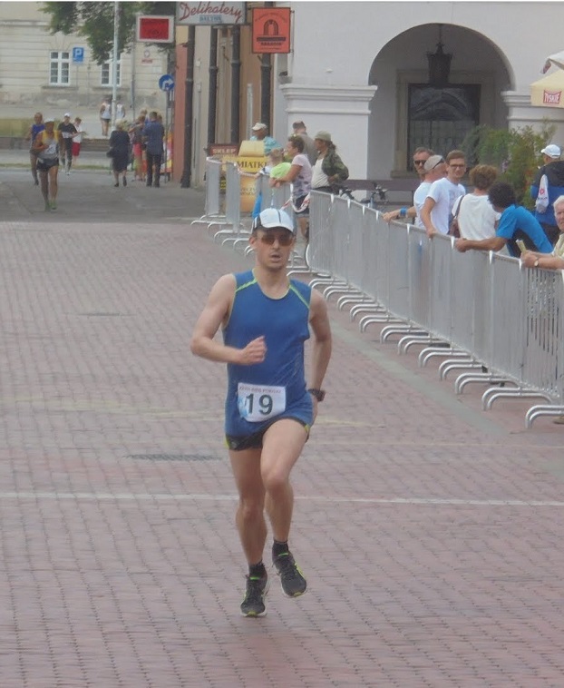 Oczywiście nie umiem równo. Ruszam o wiele za szybko. Biegamy prawie 5 pętelek, potem zbieg do mety. Pętelki są lekko pofałdowane, więc równego tempa nie ma co trzymać. Po 2km mam tempo 5:07 i oczywiście pełne gacie, że za szybko. Po 3km średnie tempo stabilizuje się na 5:10 i takie zostaje. Nie zwalniam, skoro nie mam potrzeby. Podbiegi trochę wolniej, zbiegi trochę szybciej, średnie stoi. Kręcę pętle. Na rozwidleniu między pętlą a zbiegiem do mety stoją sędziowie. Mam być przy nich 5 razy. Liczę sobie. Oni tez liczą i gdy jestem piąty raz krzyczą, że już do mety. Utrzymuję 5:10/km i jest… łatwo. Jest chłodno, wody jest dużo, jest po prostu fajnie. Biegnie mi się naprawdę przyjemnie. Na wszelki wypadek co jakiś czas przeliczam do jakiego tempa mogę zwolnić, żeby zdążyć na 10h w klasyfikacji generalnej, ale nie zwalniam, bo nie potrzebuję. Biegnę już do mety. Są kibice. Klaszczą, dopingują. Kilkaset metrów przed metą krzyczą, że spokojnie, że nikogo za mną nie ma. Wbrew pozorom to ważna informacja. Niechby ktoś spróbował się jeszcze ze mną ścigać na finiszu!! Mam niezły finisz i nie zawahałbym się go użyć!! Skręcam, przebiegam między kamienicami i wbiegam na rynek, w szpaler kibiców prowadzący do mety. Ręce w górę! Wbiegając na metę drę ryja z całej siły. 15km, 1:18:29 i 9:57:38 w generalnej.