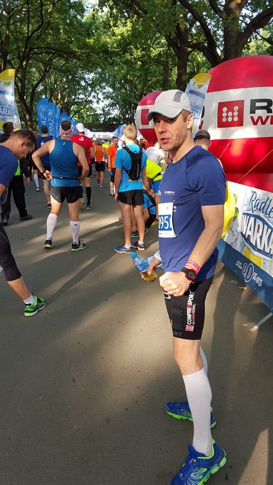°°°°°° 13. IX .2015, 5:00 rano. Po ponad dwóch tygodniach stresu przedstartowego wstaje mi się rześko. Jak zwykle nie wszystko przygotowane. Zawsze to sobie usprawiedliwiam tym, że przynajmniej będę miał powód do zerwania się z łóżka. Nie eksperymentowałem i nie zmieniłem zwyczaju. Podróż z Ronda (Klecina) na drugi koniec miasta, no może prawie koniec, trwa tyle co wypad do Sobótki. Jestem na spokojnie 1,5 godziny przed czasem wszystko zgodnie z planem... Jakim planem? Całe moje przygotowania to brak planu. Postępowanie zupełnie intuicyjne praktycznie przez cały rok. Bez jakiejkolwiek rozpiski, nie licząc kilku prostych zasad. Oczywiście było troszkę wiedzy książkowej choć najwięcej zdecydowanie wyniosłem z lektur wcale niekoniecznie polecanych debiutującym maratończykom. Poza kilkoma wyjątkami bieganie treningowe bez grupy i towarzystwa. To akurat nie był cel ale tak było po prostu najłatwiej. Inna sprawa, że głód towarzystwa zaspakajały liczne imprezy przed maratonem. W tym tylko roku 33 starty i mnóstwo sympatycznych ludzi, rozmów i doświadczeń. To największa nauka taktyki i techniki pokonywania zawodów a wielokrotnie bardzo mocna jednostka treningowa. Wszyscy zawodnicy wokół pomagają i przeszkadzają, inspirują i dekoncentrują, przyspieszają i zwalniają, zagadują albo milczą i trzeba o tym pamiętać!