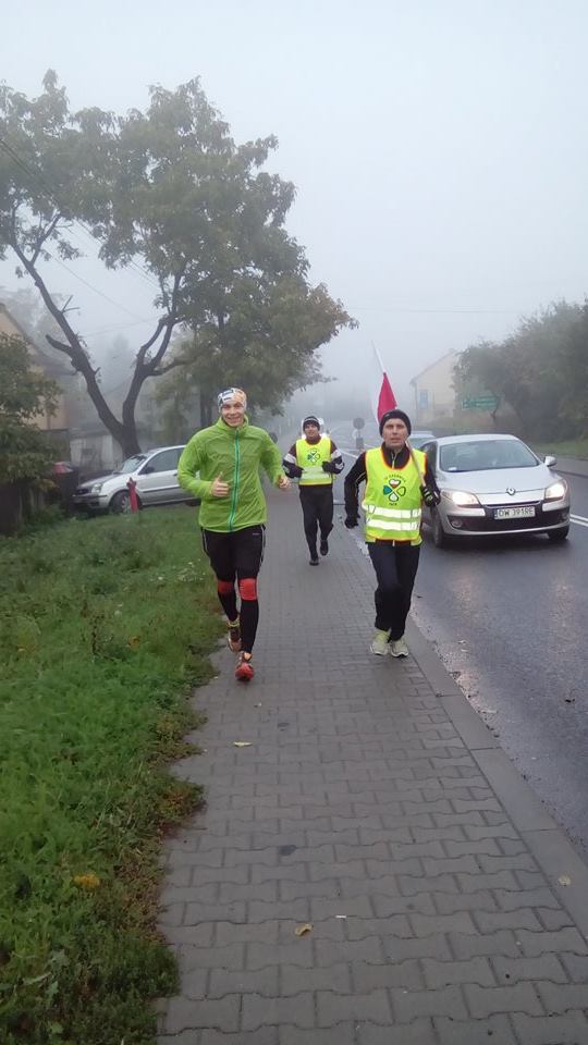 Sztafeta wyruszyła około 21 30 miałem zaszczyt rozpocz±ć bieg, w brawach i okrzykach „powodzenia” w¶ród pary z ust i deszczu z nieba ruszyłem na 130km trasę, na trasę która nie miała najmniejszego charakteru rywalizacji, cel wyprawy był oczywisty. Głowa pełna przemy¶leń, ale i skupienia biegli¶my cały czas ruchliwa droga była noc i padał deszcz, było bardzo ¶lisko, co wymagało całkowitej koncentracji, pozwoliłem sobie jednak na założenie jednej słuchawki aby rytm muzyki jak zawsze układał moje kroki. Kilometry ubywały aż miło, nie przeszkadzało mi nic, deszcz nie ustawał ani na chwile, temperatura wynosiła ¶rednio 6-8stopni. Czułem się doskonale, nie minęła chwila w mojej głowie i była pierwsza zmiana. Przekazanie zegarka i następny już na trasie. Ja sam wszedłem do busika który nas eskortował i opowiadałem chłopakom jak jest pięknie. Zmiany leciały jak szalone utrzymywali¶my naprawdę dobre tempo. Czas mijał w przyjemnej atmosferze. Każdy z nas miał przebiec po 2 zmiany, wyszło troszkę inaczej, wychodzi na to że było nam za mało, więc towarzyszyli¶my sobie nawzajem czasami na trasie wiec pobiegali¶my trochę więcej niż planowali¶my, co potwierdza tylko jak dobrze się czuli¶my, mimo że pogoda nie miała do nas lito¶ci, to my nie mieli¶my się zamiaru tym przejmować. A najważniejsze każdy czuł cel jaki był do zrealizowania, każdy wiedział że ten bieg ma jaki¶ głębszy sens…