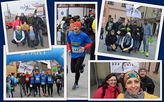 20.03.2016 Hym... dzień jak co dzień? Nie, w żadnym wypadku! Dziś pierwszy dzień wiosny :0) Może wiosna nie przywitała nas piękną „wiosenną” pogodą, ale za to my uczciliśmy jej powrót biorąc udział w półmaratonie w Żywcu. Zebraliśmy się raniutko „Harpagańską” ekipą w sile: (Isa, Agnieszka,Wiola, Irek, Krzysztof, Wojtek, Łukasz i ja Paweł) wyruszając „naszymi stalowymi rumakami” na podbój „żywiecczyzny”. Nasi kierowcy szybko i sprawnie dostarczyli nas na miejsce parkując tuż koło rynku. We wspaniałych humorach odbieramy pakiety startowe - niektórzy szybko, bo byli na „W” ;) innym troszkę zeszło :0) Tu znajomi, tam znajomi, tutaj fotka tam ulotka czas nam mijał w oka mgnieniu. Jak na 17-tą edycję to organizacyjnie sporo niedociągnięć. Poczynając od małej ilości miejsc do przebrania się i przeczekania w cieple do pory startu (cała góra hali sportowej zagrodzona przed wejściem, a spokojnie weszło by tam ze 200 osób). Wiem co mówię, bo my tam weszliśmy :0) Tuż przed startem rozgrzewka i ustawiamy się do biegu, a tu co? Jeden wielki chaos. Biegacze tłoczą się w ciasnej uliczce, a tłum 2500 ludzi napiera by zmieścić się przed linią startu. Totalna masakra, żadnych stref startowych, „wolna amerykanka”. Jedyny plus tego był taki, że było ciepło od tłumu :0) Startujemy. Pełna koncentracja, bo trzeba uważać żeby nie zostać podeptanym i nie potrącić maruderów którzy zamiast iść na tyły pakują się na czoło biegu. Sam nie wiem jakim cudem (pomimo biegu slalomem) udało się biec w miarę dobrym tempem te pierwsze km? Początek nie napawa optymizmem sporo biegaczy mnie wyprzedza (może ja też jestem takim maruderem) :0) ale patrząc na czas 1km jest ok. Drugi kilometr i zaczyna się kłopot, za mocno zasznurowałem lewego buta i zaczyna boleć mnie piszczel. Szag by to trafił myślę ... „może przejdzie za chwilkę” i naciągając but próbuję poluzować sznurowadła. Nic z tego, mija piąty km, a mnie zaczyna cierpnąć noga. Zły na siebie, że nie podjąłem tej decyzji wcześniej, schodzę na bok i poprawiam sznurowadła. Tak, to trzeba było zrobić od razu, a nie martwić się o sekundy straty. Siódmy km ... nareszcie zaczynam czerpać przyjemność z biegu bo noga już „dochodzi do siebie”. Zaczynam nawet trochę wyprzedzać. Mniej więcej od 10km zaczyna się prawdziwa zabawa. Do góry i w dół, oto cały urok górskiego biegu ulicznego. Trasa niezwykle urokliwa, niestety szczyty gór mocno zamglone, pogoda nie rozpieszcza nas, więc atrakcji turystycznych za wiele nie było. Punkty z wodą mocno oblegane, ale jakoś da się zrobić łyka, czego nie mogą powiedzieć ciut wolniej biegnący zawodnicy, bo zabrakło im kubków. Jak opisał nam Łukasz „popijałem żel z pięciolitrowej butelki” niezłe jaja :0)( tylko czy im było do śmiechu?) Od 16km to już selekcja. Dwa długie podbiegi uczą pokory, sporo ludzi maszeruje. Ja biegnę dalej i to całkiem fajnym tempem, co tracę na podbiegu niweluję zbiegając. 19 km koniec kieratu teraz już tylko z górki. W około sporo kibiców dodaje nam woli walki. Niestety tuż przed metą znowu chaos organizacyjny ludzie zawężają (i tak ciasną uliczkę), że ciężko finiszować na ostatnich metrach. Żeby tego było mało, jakiś nieodpowiedzialny tatuś biegnie (zastawiając całą wolną przestrzeń) z dwojgiem małych dzieci. Ja rozumiem, że to jet fajna sprawa dla tych dzieciaków, ale pytanie do tego tatusia CZY TO BYŁO DLA NICH BEZPIECZNE!? Nasze gwiazdy Wiola, Aga i Irek na trybunach szaleją mobilizując nas na ostatnich metrach. Jest upragniona meta, niezły czas i kolejny fajny medal do kolekcji. Niestety nie dla wszystkich, bo „ktoś coś pogubił” i medale zaginęły. Co z tego że doślą , to już nie to samo :0( Dziewczyny zbierają resztę Harpaganów na mecie i wracamy na halę sportową (na nasze tajne miejsce) :0) Na szczęście posiłku na mecie nie zabrakło nikomu, nawet naszym kibicom (tutaj duży plus dla organizatora) :0) Dzięki Harpagani za miło spędzony dzień pełen humoru, wrażeń, potu i zadowolenia z pokonania kolejnego biegowego wyzwania :0)