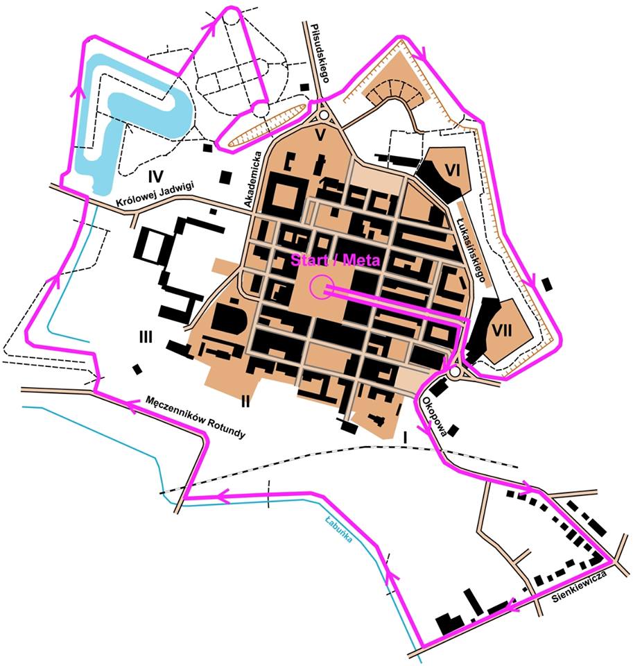 Ulica Sienkiewicza - dobiegam prawie do rzeki Łabuńki, przed rzeka skręt znowu w prawo wzdłuż jej prawego brzegu. Po prawej stronie mijam dany budynek Elektrowni. Teraz tam mieści się browar i Szkoła wyższa. Jeszcze lekki podbieg w górę i znowu skręt w prawo. Jestem teraz na drodze prowadzącej na Rotundę – miejsce kaźni z czasów II wojny światowej. Biegacze biegną w drugą stronę – czyli w stronę odrestaurowanych murów twierdzy okalającej miasto. To były czasy – kiedy to miasto Zamość nie dało się potopu szwedzkiego. Tu mamy gdzieś drugi kilometr trasy.
