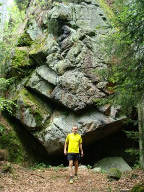 Jako że nie zamierzamy spędzać na wycieczce całego dnia, powoli myślimy nad powrotem. Czarek chce wracać prosto do samochodu. Co to, to nie. Mam swoje sposoby. Chwilę zbiegamy ze szczytu czerwonym szlakiem, gdy po prawej stronie zauważam ślad po starym niemieckim szlaku. Nakłaniam mojego kompana do "zobaczenia" co tam jest, co będziemy jak standardowi turyści po szlaku biegać i spokojnym ludziom przeszkadzać. Trafiamy na zarośnięty punkt widokowy, na którym już kiedyś byłem z Agi, zresztą nie jesteśmy tu sami, kilka osób właśnie wraca stamtąd na szlak. Stojąc na skale zauważam schody prowadzące w dół, już chyba mniej uczęszczane.