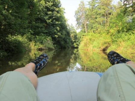 W końcu kapitan Jarek zarządził, że mam się położyć na dnie pontonu i trzymać wiosło nad wodą. Najpierw pomyślałam, że to jakaś nowa strategia, ale szybko wyjaśniło się, że mam po prostu nie utrudniać i tak niełatwego zadania płynięcia z nurtem. I wiecie co? Ta nowa rola bardzo szybko przypadła mi do gustu :) Leżałam sobie wygodnie, mając kapok za poduszkę, od czasu do czasu tylko przyczyniając się do sprawy poprzez odpychanie się wiosłem od drzewa lub brzegu, na którym się zaklinowaliśmy. Miałam czas, żeby ponapawać się przyrodą, robić zdjęcia kaczuszkom, które płynęły przed nami, zaciekawionej krowie, obserwującej nas z brzegu i bocianom przelatującym nad nami. Tylko bobrów nie zobaczyliśmy. Wierzę jednak, że są, bo drzew dużo poprzewracanych.