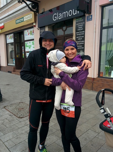 Myśląc, że zapisuję nas na Bieg Niepodległości w Warszawie zapisałam nas na Bieg z Wąsem do Wrocławia a skończyło się tym, że pobiegliśmy Jedenastkę w Oświęcimiu. Pokręcone? Jak to u nas! :) Spasował nam jednak ten Oświęcim bo jak jest okazja żeby się spotkać i zrobić coś razem to trzeba takie szanse wykorzystywać koniecznie - wystartowaliśmy zatem we czwórkę z Marcinem i Eweliną. Brawo, brawo dla wytrwałych co się nie poddają. No i nie ukrywam, że było nam to bardzo na rękę bo oto kolejna babcia-ciocia na czas biegu otoczyła swoją czułą opieką Henia a potem i nas przygarnęła pod swój gościnny dach i kominek i tym samym załapaliśmy się na pyszny obiad i przemiłe świętowanie na okoliczność imienin Marcina w jego rodzinnym domu. Jesienne bieganie w Oświęcimiu będzie zatem kojarzyć mi się z gorącym rosołem i kominkiem tak jak letnie (LFO) z czereśniami i altanką... Dzień był mroźny ale do biegania jak znalazł. Trasa zaczynała się na rynku i po pokonaniu dwóch pętli wiodących ścieżkami nad Sołą na rynku się kończyła. Łagodnie, bez podbiegów, trochę asfaltu trochę ścieżek szutrowych, miejscami dość wąskich ale że biegaczy nie było zbyt wielu dało się biec bez ograniczeń. Bieg ukończyłam z czasem 54:26 jako 8 kobieta w kategorii. Średnie tempo udało się utrzymać poniżej 5 min/km (4:56) co oznacza, że jest postęp, niestety tym razem nie udało mi się dotrzymać kroku mężowi. W sumie na mecie stanęło 260 biegaczy w tym zaledwie 68 kobiet.