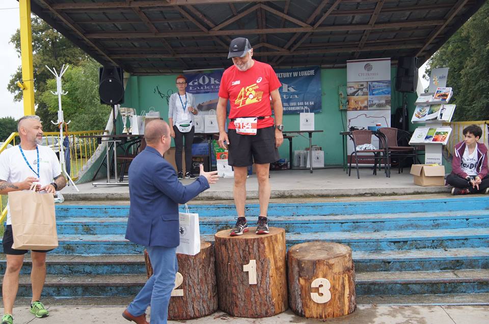 Kiedy biegałem już 2-3 lata i widziałem, jakie czasy osiągają moi rówieśnicy, a nawet biegacze z wyższej kategorii wiekowej, to powiedziałem – ja kiedyś stanę na pudle, ale pewnie w M90, a może dopiero w M100. Mam już kilka miejsc na pudle w kat. M60, ale to wyróżnienie w Łukcie mnie zaskoczyło i rozbawiło.