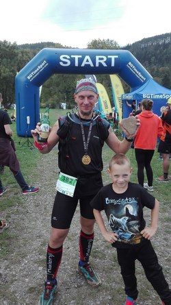 Pora skonsumować żela i łyknąć shota magnezowego aby przy zbiegach nie łapały skurcze. Na podejściu uda dostały mocno w kość a teraz dostaną jeszcze bardziej, do tego zaczną bardziej pracować łydki. Szlak w dół nie należy do przyjemnych, miejscami kamienie jak w korycie strumienia górskiego, kto tu naznosił tyle otoczaków, sporo z nich jest bardzo luźna i trzeba zbiegać dosyć zachowawczo żeby nie stoczyć się wraz z nimi ze zbocza. Podczas zbiegu tak bardzo skupiłem się nad tym gdzie stawiam nogi że dopiero teraz zauważam że chmury gdzieś się rozwiały i wyszło słońce. To dlatego zaczyna mi być tak gorąco :) Na ok 17km jest punkt odżywczy, szybko uzupełniam iso, wypijam cały kubek na miejscu, biorę kolejnego shota magnezowego, bo czuję że te zbiegi dają ostro popalić mięśniom a do mety jeszcze ok 8km. Przy puncie źródełko w którym można się nieco odświeżyć, chlustam sobie w twarz kilka razy pełnymi garściami wody - ach co za uczucie! Mógłbym cały się tu zamoczyć ale trzeba napierać dalej. Zbieg w dół staje się bardziej stromy i mniej kamienisty ale pojawiają się korzenie i czarna ziemia, oj będzie ślisko, trzeba uwa...aAA...ŻAĆ! Q...wa! No właśnie. Dobrze, że zwolniłem niemal do zera bo dzięki temu przejechałem na d...e tylko jakieś 2-3m. W sumie nawet nie poobijałem się bardzo tylko podczas poślizgu tak się spiąłem że skurcz mnie złapał od razu w łydkę i udo jednocześnie. Siedzę sobie tak na tyłku i podsumowuję straty, ręka - cała, noga - cała, zegarek - żyje, upadek poszedł bardziej na lewy półdupek więc telefon w tylnej kieszonce też przeżył. Czekam chwilę aż skurcz nieco odpuści, jedna dziewczyna która mnie właśnie mija i widziała mój niezbyt udany telemark pyta czy wszystko ok. Odpowiadam, że tak, tylko czekam aż skurcz odpuści. Aby się podnieść zginam drugą nogę i... AAAA... trafiłem kumulację! Skurcz w drugiej nodze. O rzesz ty w mordę, tego się nie spodziewałem. Przecież nie mogę skończyć biegu w takim miejscu z powodu skurczu, zaczynam kuśtykać do jakiegoś puntu podparcia, kilka metrów dalej zaczyna się asfaltowa droga, więc opieram się o barierki przy drodze i zaczyna kolejno rozciągać głównie łydki. W międzyczasie naliczyłem ok 15 osób które mnie wyprzedziły - no szkoda, ale co zrobić. I tak nie jest źle bo czas jak na razie lepszy niż się spodziewałem. Po chwili zaczynam iść, przechodzę w lekki trucht ale daję sobie jeszcze chwilę odpoczynku i schodzę do rzeczki aby umyć chociaż ręce z ziemi i trochę się orzeźwić. Jak to mówią - górska woda zdrowia doda ;) Ruszam dalej w niezbyt oszałamiającym tempie ale skurcze na szczęście nieco odpuszczają, choć cały czas czuję że nie mogę przyspieszyć bo gdzieś tam czuję jednak jakby ponownie chciały chwycić i to nie tylko w łydki i uda ale też a stopę i hmm.. piszczele? Po paru minutach nie jest już tak źle i mogę biec niemal normalnie. W między czasie parę osób jeszcze mnie wyprzedza, ktoś rzuca przelotnie tekst "za chwilę dopiero się zacznie"??? WTF? Że niby co takiego? Przecież to już niemal 5 km do mety - no i się zaczęło. Podejście o długości ok 1200m z różnicą wzniesień ponad 200m, w kilku miejscach nachylenie przekraczające 34% i do tego błoto. Kto ma kijki i lepsze podparcie napiera ostro pod górę, pozostali praktycznie wdrapują się ostatkiem sił na górę. No, teraz już tylko z górki ale nie ma tu mowy o biegu, przynajmniej na pierwszym odcinku - błoto, kamienie, praktycznie schodzimy rowem wyżłobionym przez spływającą wodę, uważając aby nie utopić butów w lepkiej brei. Wreszcie docieramy do asfaltowej drogi i zbiegamy nią już praktycznie aż do mety. Te ok 2km też ostro dają popalić, spuszczam nieco hamulce i udaje mi się biec czasem poniżej 5:00/km, obrywa się za to na tym zbiegu kolanom. Ostatni fragment do mostka przebiegam już z zaciśniętymi zębami, jedynie widząc fotografa na drugim końcu mostka udaję że czuję się dobrze ;) (Mam nadzieję że tą fotę gdzieś wyszperam w sieci) Za mostkiem czekają moi kibice - żona i mama, Piotrek biegnie w moją stronę i przybija piątkę. Ostanie kilkaset metrów do mety pokonujemy razem i wbiegamy na metę z czasem 3:18:54! Na mecie piwko które weszło jak gorący nóż w masło a od synka dostałem (a jakże!) otoczaka w kształcie serca :)