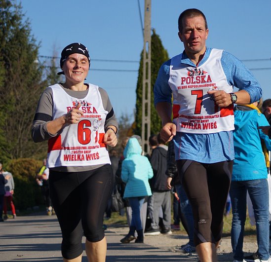 No! Ustalenia poczynione, hymn odśpiewany i ... ruszamy na trasę. Od początku tempem, które nie zostawia cienia wątpliwości, że się śpieszymy. Zaprzyjaźniony biegacz, który zawsze biegnie w Niepodległościowej Jedenastce z żoną, pyta mnie w biegu „Gabi, ty dziś nie zamykasz stawki?”, „No, dzisiaj nie” – pada moja odpowiedź i biegniemy. Szczerze mówiąc zastanawiam się, czy dam radę. Czy utrzymam tempo, czy nie przejdę do marszu na tym upiornym przeszło trzykilometrowym podbiegu, czy zdążymy na transport do Krakowa. Biegniemy. I gadamy. Bo my z Maćkiem na Niepodległościowej Jedenastce zawsze musimy się po prostu nagadać. Za cały rok :)