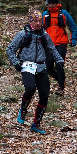 O Leśniku słyszałem już jakiś czas temu. Słyszałem tyle, że bieg fajny, kameralny, w pięknych okolicznościach przyrody, że na krótszych dystansach są bardzo duże limity czasowe a więc można podejść do startu spokojnie, bez napinki, bo limit czasowy raczej nikogo tutaj nie wykluczy. Nikt tylko nie wspominał o tym, że organizatorzy mają tendencje sadystyczne jeśli chodzi o prowadzenie trasy. Jeśli ktoś się spodziewał przyjemnej trasy prowadzonej wzdłuż wytyczonych szlaków turystycznych to się mocno zawiódł. Jeśli ktoś myślał, że po ostrym zbiegu będzie choćby krótki płaski odcinek na złapanie oddechu to tez się zawiódł bo zwykle zbieg kończył się jeszcze bardziej stromym podejściem. Jeśli ktoś liczył że się rozpędzi na bardziej łagodnych zbiegach, to się przeliczył bo jak tu zbiegać po luźnych kamieniach przysypanymi liśćmi pod którymi czai się gdzieniegdzie gruba warstwa lodu. Oczywiście Ojciec Dyrektor pomyślał również o nizinnych biegaczach i zostawił im ok 2-3 kilometrowy odcinek, który teoretycznie można było przebiec. W miarę płaski odcinek o przyjemnej dla stopy nawierzchni, bez czających się na nasze kostki ostrych kamieni. No tak, tylko po 20 km w nogach kto miał jeszcze siły tutaj biec? Truchtanie, slow-jogging – ok ale do szybkiego biegu mało kto był już tutaj zdolny.