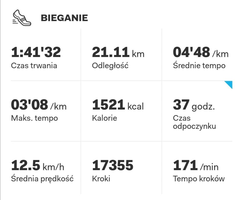 Po tym biegu wrociłem znowu do squasha, a do biegania wróciłem tydzień temu, w poprzedni± niedzielę miała miejsce pierwsza w tym roku 12-kilometrowa przebieżka. Powtórzyłem to w ostatni± sobotę, a wczoraj odbył się test na 15km...tzn. miał się odbyć test na 15km. Biegło mi się bowiem tak dobrze, że wyszedł z tego półmaraton (21,1km). Czas znakomity jak na samotny bieg (1:41:32), jeszcze tak szybko nigdy nie pobiegłem na treningu takiego dystansu.