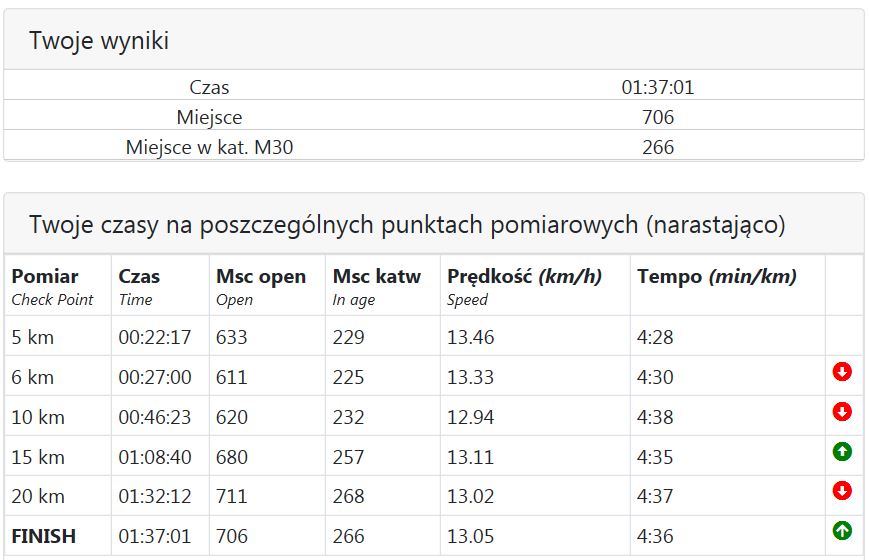Pogoda była znakomita do biegania, no może poza tym wiatrem w twarz po nawrocie...ale nie można mieć wszystkiego. Biorąc pod uwagę to, że pierwsza część dystansu, ta z wiatrem, wydawała się łatwiejsza do pokonania, postanowiłem rozpocząć bieg razem z grupą na 1:35, mimo że życiówka prawie 2 minuty słabsza. Około 7-8 kilometra musiałem nieco zwolnić, żeby się nie spalić, a po nawrocie planem było pobiec każdy kilometr poniżej 5 minut. Udało się to zrealizować z naddatkiem i początkowo nieoczekiwany potencjalny nowy rekord stał się coraz bardziej realny. Za późno chyba jednak to do mnie dotarło i nie było już gdzie odrobić brakujących sekund. Ostatecznie zabrakło ich 14, ale czas 1:37:01 to i tak rewelacja jak na tę część sezonu, i jednocześnie drugi wynik w życiu.
