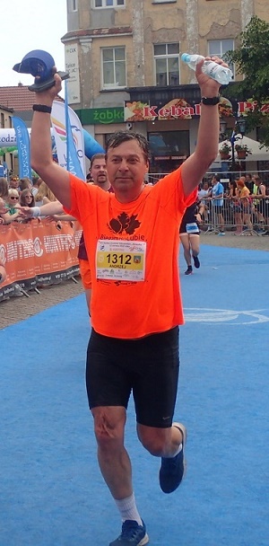 Po maratonie w Dębnie zdecydowałem się na półmaraton w Grodzisku Wielkopolskim Półmaraton "Słowaka" (12.06.2022 r.). Na ten bieg pojechałem z Jurkiem zaraz po Biegu Marszałka w Sulejówku. Już wcześniej wiedziałem o tym, że zdaniem biegaczy ten półmaraton jest najlepszym takim biegiem w Polsce. Po biegu mogę jedynie potwierdzić to zdanie ze względu na świetną organizację i wysoką dbałość o zawodników. Powiedziałem nawet organizatorom, że jest to półmaraton z najwyższej półki takich biegów w Polsce. Nie było tym razem w zestawie startowym koszulki, ale były inne atrakcje. Był pas biegowy z torebką 4F, żel, magnez, odżywka - suplement diety, dwa piwa i świetna torba-plecak. Pogoda była upalna, podobna do tej z Biegu Marszałka w Sulejówku. Niebo bez chmur, bez wiatru, pełne słońce, temperatura w cieniu 27 stopni podczas startu o godz. 9.00, a na słońcu chyba ok 35 stopni albo więcej. Potem było tylko ciepłej. Pewna grupa zawodników nie ukończyła biegu. Przy tych warunkach od razu założyłem wolne tempo, aby dobiec do mety, a w drugiej połowie nieco przyspieszyć. Organizator zadbał o to aby wszystko przygotować wcześniej i już w przeddzień startu wszystko było przygotowane, łącznie z balonikami w strefie startowej w różnych kolorach zgodnyvh z kolorem tła numeru startowego. Czerwony dla najszybszych, potem żółty kolor, a dla najwolniejszych kolor niebieski. Były dwie pętle do przebiegnięcia, dokładnie oznaczone co kilometr. Na trasie były bardzo często punkty z wodą, przy tych punktach był mały basen z wodą do chłodzenia, izotoniki, banany. Co chwila były kurtyny wodne, a także kibice polewali z węży wodą z własnego domu. Na niemal całej trasie było słychać doping kibiców co sprawiało niesamowitą atmosferę. Miasto czyste, mnóstwo kwiatów. To wszystko można zobaczyć na zamieszczonych zdjęciach. Na finiszu był rozłożony dywan. Założenia biegowe zrealizowałem w średnim tempie ok. 6:30/km. Na 10 km było 1:04. Upał wzmagający się wraz z upływem czasu powodował przegrzanie organizmu dlatego też od samego początku oblewałem się wodą zarówno głowę oraz ramiona i ręce. Bez tego chłodzenia nie ukończyłbym biegu. Na ostatnim kilometrze dobrze przyspieszyłem I wyprzedzilem dość dużo zawodników. Część z nich maszerowała, nie mogła biec. Dwie osoby potrzebowały pomocy medycznej. Na trasie była muzyka, bębniarz, orkiestra i inne zespoły. Ostatecznie ukończyłem bieg z czasem 2:16. Przy tym upale była to jedynie rozsądna decyzja, aby nie biec szybciej, bo nie wiadomo jak to mogłoby się skończyć. Na mecie maratonka Pani Wanda Panfil zawiesiła na mojej szyji oryginalny medal z ruchomą częścią środkową. Po minięciu mety każdy dostał wodę i izotonik. W dalszej części strefy mety zawodnicy na otrzymali z kilku stoisk coś do zjedzenia. Była kiełbasa z bułką, krem pomidorowy z papryką, chleb ze smalcem i ogórkiem kiszonym, młody ziemniak z twarogiem z odrobiną oleju, ciastko oraz do wyboru kawa z mlekiem lub bez oraz herbata. Największą atrakcją cieszyło się stoisko z zimnym piwem z tutejszego browaru. Tam była najdłuższa kolejką. Na scenie grał zespół muzyczny, a pod sceną towarzystwo tańczyło. W strefie kibica spotkałem Pana Henryka Pascala, Renatę, Henia z 2 lokatą w naszej kategorii wiekowej, Gienia z kategorii wyższej, Grzegorza z Lublina i ekipę z Warszawy. Na zakończenie wręczenie nagród za zajęte miejsca i losowanie nagród, między innymi dwóch rowerów. Zdjęcia jakie robiła ekipa Fotomaratonu. Zdjęcia będą do ściągnięcia bezpłatnie. I jak tu jest kochać tego biegu? Organizatorzy biegów w Polsce mogliby wzorować się na Półmaratonie "Słowaka". Polecam ten bieg każdemu. Muszę tu przyjechać za rok. Trzeba tylko przypilnować terminu zapisów, bo miejsca znikają bardzo szybko. Już teraz wiem, dlaczego tak szybko.