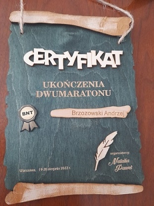 Dziś zakończył się Dwumaraton organizowany od wielu lat przez Natalię i Pawła. Udział w nim polega na pokonaniu dwu maratonów dzień po dniu. Byłem już dwukrotnie zapisany na ten dwumaraton w poprzednich latach, ale z różnych przyczyn pobiegłem tylko jeden bieg. Do trzech razy sztuka, bo tym razem było to moje trzecie podejście do tego dmumaratonu. Tym razem udało się ukończyć oba biegi w limicie. Piątkowy bieg zrobiłem w czasie 5:00:51, a w sobotę wyszło 5:42:32. Pierwszy maraton miał start o 14.00 a drugi o 7:00. Pogoda w piątek była wyjątkowo upalna i z dużą wilgotnością. Zanim rozpoczął się bieg byłem cały mokry. Biegi były rozegrane na pętli 3,5 kilometrowej trasy na Młocinach w Warszawie. Tam rozgrywane są zawody City Trial. Start jest przy szlabanie i dobieg do drugiego szlabanu a potem 12 okrążeń. Temperatura dochodziła do 36 stopni, więc musiałem na każdej pętli schładzać się i zabierać z sobą wodę do picia w butelce. Bez tej wody nie udałoby się ukończyć biegu. Na przedostatnim okrążeniu na 4,5 km przed metą na trasie pojawił się dzik. Musiałem się zatrzymać, bo on też zwrócił na mnie uwagę. Zatrzymałem następnego biegacza i pokazałem - co pojawiło się na trasie. Po lewej stronie drogi na skraju lasu buszowały małe warchlaki. A więc to locha pilnuje małych dzików. Z nią nie ma żartów. Będzie bronić swoje małe. Bardzo wolno podeszliśmy do lochy i minęliśmy ją z odległości ok 4 metrów. Powoli oddalaliśmy się ob niej. Nie mogliśmy biec, bo mogła się rzucić w naszą stronę. Po ok. 100 metrach wróciliśmy do biegu. Straciłem ok. 3 minut. Przez to, nie udało mi się złamać 5 godzin. Finisz. Trzeba szybko się zbierać, bo drugi bieg zaczyna się za 12 godzin. Kilka godzin snu i pobudka o 4 rano. Dziś rano pojechałem na start z Jankiem, który zdecydował się tylko na połówkę. Nie udało mi się namówić Janka na cały maraton. Rano dzisiaj było chłodniej ok. 23-25 stopni, więc było lepiej. W drugiej części biegu ponownie zrobiło się gorąco. Dobrze, że była woda i cola na punkcie. Między 21 a 32 km biegło mi się wyśmienicie. Ostatnie dwa okrążenia trzeba było zrobić nieco wolniej, bo mój organizm wysyłał sygnały, że nie wytrzyma tempa 6 min/km. Część zawodników nie ukończyła pierwszego maratonu, a cześć zrezygnowała z drugiego maratonu. Okazało się, że byłem najstarszym uczestnikiem tego dwumaratonu, a więc można nawet mnie - wystartować i ukończyć oba maratony w limicie. Na zakończenie biegu każdy z uczestników oprócz medalu otrzymał pięknie wykonany imienny certyfikat ukończenia dwumaratonu. Obsługa na punkcie była wzorowa, tak jak organizacja biegu. Wszyscy dbają o zawodników. Fotograf zrobił mnóstwo zdjęć i od razu zamieścił na stronie biegu na fb. Biegi są wymagające, ale warto wystartować w tych biegach. Następny dwumaraton za rok - oczywiście z moim udziałem jak zdrowie pozwoli.