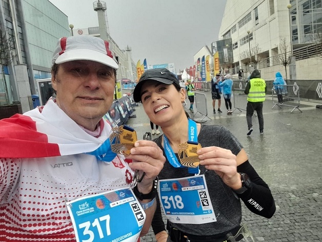 Robię zdjęcia mecie. Przechodzę dalej. Dostaję medal. Dalej dostaję folię do przykrycia. Czekam na Martę. Wreszcie Marta dociera do mnie. Też ma medal, więc, można udać się po koszulki. Na mecie jest woda i piwo bezalkoholowe. Nie ma ani ciepłego posiłku ani herbaty. Tu koszulki dostaje się po ukończonym biegu, a nie dlatego, że się zapisało na bieg. Aby dostać koszulkę, trzeba było dotrzeć na metę i tam zgłosić się do odpowiedniego namiotu. Organizatorzy wycinali część z numeru startowego i wtedy można było otrzymać koszulkę z biegu.