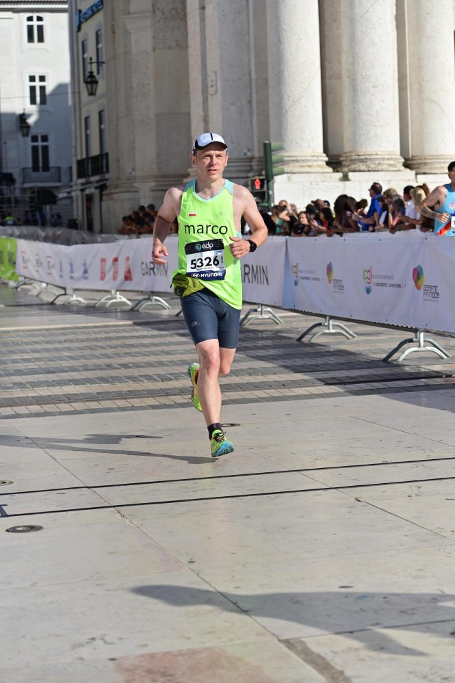 Około 35 km znów podchodzę. Piję wciąż litry wody choć nie czuję jakiegoś oszałamiającego ciepła. Skoro inni mogą to ja też...nie mogę. Po 35 km dogania mnie Portugalczyk z ręką na temblaku. Podaje mi bidon z wodą aby drugą kończyną i zębami otworzyć sobie żel. Po czym odbiera ode mnie napój i oddala się. Koszmar (mój, nie jego) trwa. Szerokie ulice Lizbony: przegapiam Belem po prawej stronie, nie przegapiam pięknego klasztoru Hieronimitów po lewej. Teraz most, olbrzymie przęsła „Ponte 25 kwietnia”.Snuję się po asfalcie w tempie 4:50-5:00 i czekam aż mnie dogoni grupka na 3:15. Dzieje się to na 38 km Znów potrzebuję przejść 100-150 m aby ostatnie 3,5 km przebiec bez zatrzymywania. Jest coraz bliżej choć nogi nie współpracują. Bruk na promenadzie nad Tagiem (uwielbiam bruk na 40 km maratonu ;-), skręt „do miasta”. Słychać już spikera na Placa de Comercio. Wbiegniemy na niego od strony Rua Augusta mając przed sobą szerokie wody Tagu. Z przeciwnej strony uczestnicy półmaratonu. Trasy biegną koło siebie przez ostatnie 300 choć półmaratończycy zaczynają swój bieg z drugiej strony miasta, z mostu Vasco da Gama. I wreszcie przebiegam pod łukiem tryumfalnym i przekraczam linię mety. Z finiszu nic nie wyszło. Cieszę się i doceniam, że jest meta, po 3h18’27” Unoszę ręce, biorę medal i loda (świetny gadżet na upalnej mecie) i dopiero teraz czuję gorące płomienie październikowego słońca. Termometr wskazuje 28*C.