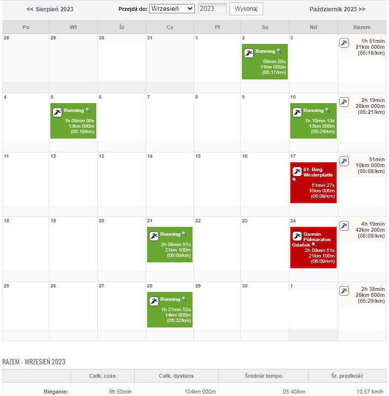 24.09.2023, Gdańsk, 10. Garmin Półmaraton Gdańsk, dystans: 21,097km, czas: 2:09:51, tempo 6:09/km (Jako pacemaker na 2:10)