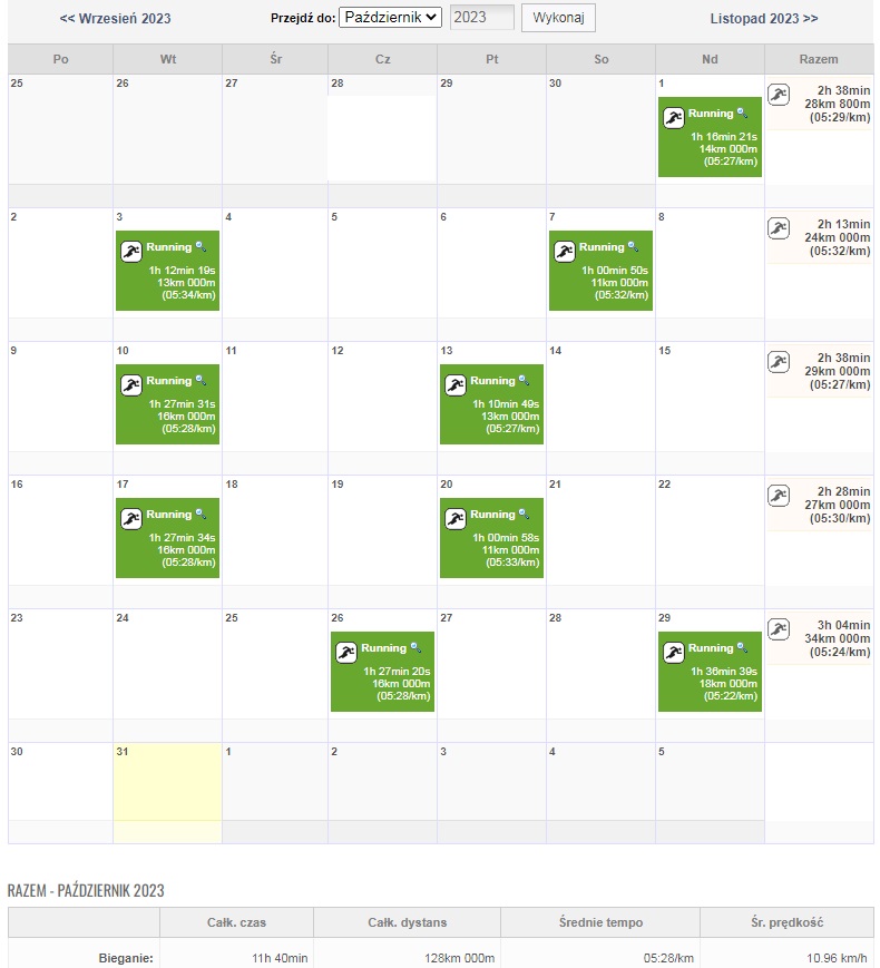 Te październikowe 128km to najdłuższy miesięczny kilometraż od... maja 2022. Szczerze, to nawet nie wiedziałem, że wyszło ich aż tyle, ale to cieszy. W październiku zaliczyłem też 1000km w tym roku, o całe 8 dni później niż w analogicznej sytuacji rok temu. Wierzę jednak, że zeszłoroczny całoroczny wynik (1265km) jest w zasięgu moich rąk (a raczej nóg, hehe) i zrobię wszystko, by to uczynić.