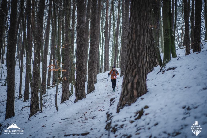Dobrze ! Kilkukrotnie ktoś z grupy wykrzykuje „tędy” i błądzący zawracają na właściwą drogę. Odblaski są ale słabo widoczne. Czyżbym miał jednak za słabą latarkę ? Nie, kiedy zostaję sam świeci wyraźnym „płomieniem”. Zgubiłem światełka z przodu, odwracam się, co jakiś czas pojedyncze błyski rozświetlające mrok. Świetnie, że leży śnieg bo księżyc ledwo widać zza chmur. Jest ponuro ale nie jest strasznie. Działa adrenalina. I tylko w głowie obawa, że się zgubię na początku biegu. Doganiam trójkę biegaczy i trzymam kontakt. Robi się jaśniej. Jest 7. Myślałem, że potrwa to trochę dłużej, wschód słońca dopiero za 45 minut. Widać już dobrze tasiemki i strzałki, trasa jest dobrze oznaczona. Docieram na pierwszy punkt żywieniowy po 22 km w dobrym czasie (2h12) i na dobrym miejscu (20) choć mocno zmęczony. Jem bułkę z kremem czekoladowym, kawałek banana i opijam się lodowatą colą. Żele zachowuję na później. I ruszam. Następny punkt za 14 km. Szybko zostaję sam na trasie i wówczas dopada mnie zmęczenie. Przeogromne. Tak jakby wszystkie nieprzespane noce z ostatniego roku wróciły do mnie w jednej chwili i chwyciły za ręce. Wciąż biegnę ale czuję, że za chwilę każde wzniesienie będzie pretekstem do marszu.