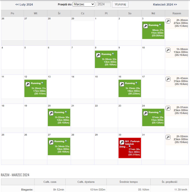 31.03.2024, Gdańsk, 561. Parkrun Gdańsk, dystans: 5km, czas: 27:36, tempo: 5:31/km (bieg z Tomkiem w wózku)