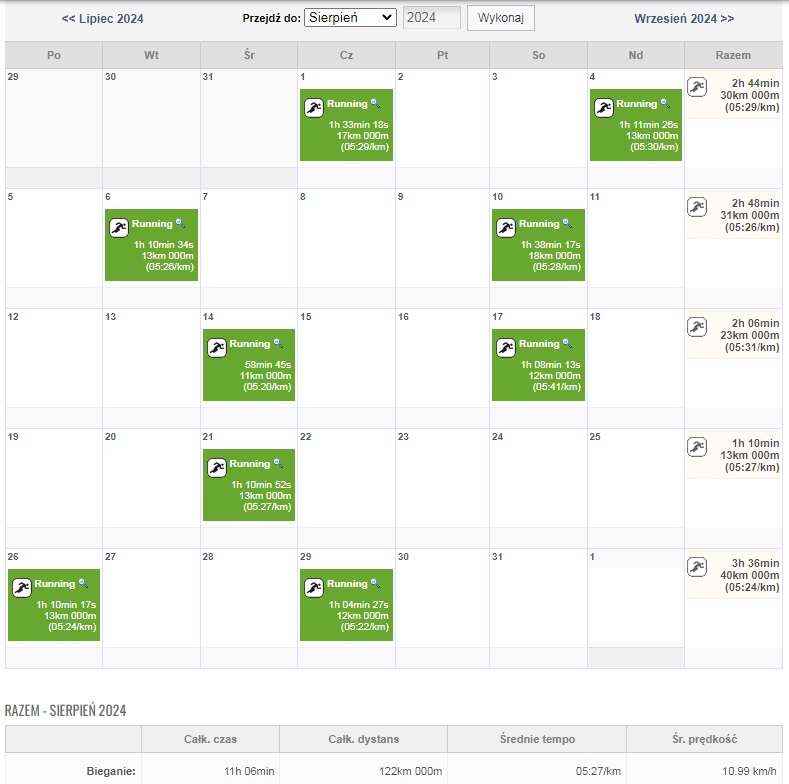 W poprzednich dwóch miesi±cach z powodu kontuzji przebiegłem w sumie tylko 96km, w sierpniu odbiłem to sobie z nawi±zk±. To cieszy. Nadal jednak to nie jest ta sama rado¶ć z biegania co jeszcze w poprzednim roku.