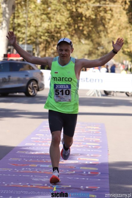 Via CAvour, Via Roma. No zmęczony już jestem ale odliczam kilometry i pilnuję czasu. Oby nie było kryzysu to „lecę” na wynik poniżej 3h10" Wyprzedza mnie dwoje biegaczy. Włoch i wysoka blondynka. Nie jestem w stanie się „przylepić” ale nie tracę dystansu. Na starówce ludzi już całkiem sporo, otwarte knajpy, gwar, Aperol, sporo oklasków, a ja znów wspinam się koło Quatro Canti i katedry. Świadomość, że to już blisko nie sprawia, że podbieg staje się łatwiejszy ale czuję się dużo lepiej niż na dwóch, poprzednich, miejskich maratonach. Kiedy do końca pozostają 3 km mija mnie karetka i widzę interwencję lekarską u biegacza, leżącego obok trasy. Kiedy pozostają 2 km mija mnie pacemaker, który biegł z balonikiem na 3h15" To ten co miał mnie wyprzedzić już dawno temu ale teraz powinien być pięć minut za mną ! Co u licha ? Nie ma jednak balonika tylko koszulę pace"a. Biegnie dla siebie. Pewnie nie miał już kogo prowadzić...Wreszcie Via Ruggero Settimo, jestem już bardzo zmęczony. Przede mną wciąż rosła blondynka. Okrążenie teatru i skręt do mety. Czy jest tu gdzieś moja Rodzina ? W końcu jestem trochę „za wcześnie”. Wbiegam na metę szeroko rozkładając i wznosząc ręce. Po raz 46 przekraczam metę maratonu, po raz 21 poniżej 3h10" ! Mój czas to 3h09"31” A teraz mogę naprawdę odpocząć...lecz nawet końcowa euforia nie zachęci mnie do spróbowania lokalnego „specjału” jakim jest kanapka ze śledzioną ;-)