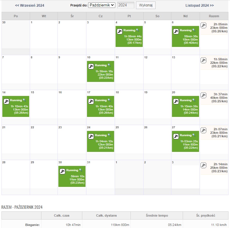 Miesiąc, gdzie z reguły treningi wyglądały tak samo. Po słabszym bieganiu następowało te całkiem udane – i tak w kółko. Jak nic, jesienna aura robiła swoje. Ogółem jednak biegać mi się chciało i nawet gorsza dyspozycja nie wpływała negatywnie na moje nastawienie.