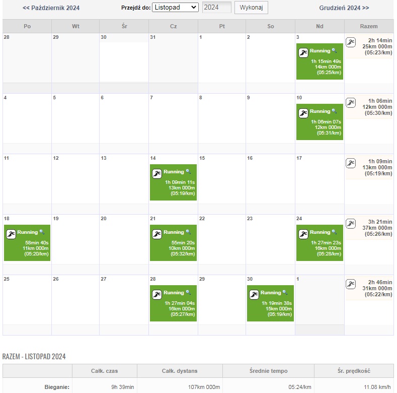Będzie krótko, bo nic istotnego się nie wydarzyło. Spokojny miesi±c, bez większych szaleństw, ale jednocze¶nie najgorszy objęto¶ciowo od lipca, choć wydawało mi się, że tych kilometrów w listopadzie będzie więcej. Jednak to nie najważniejsze, bo plan minimum na ten rok (1200km biegiem) jest już dosłownie na wyci±gnięcie ręki – zostało raptem 38km.