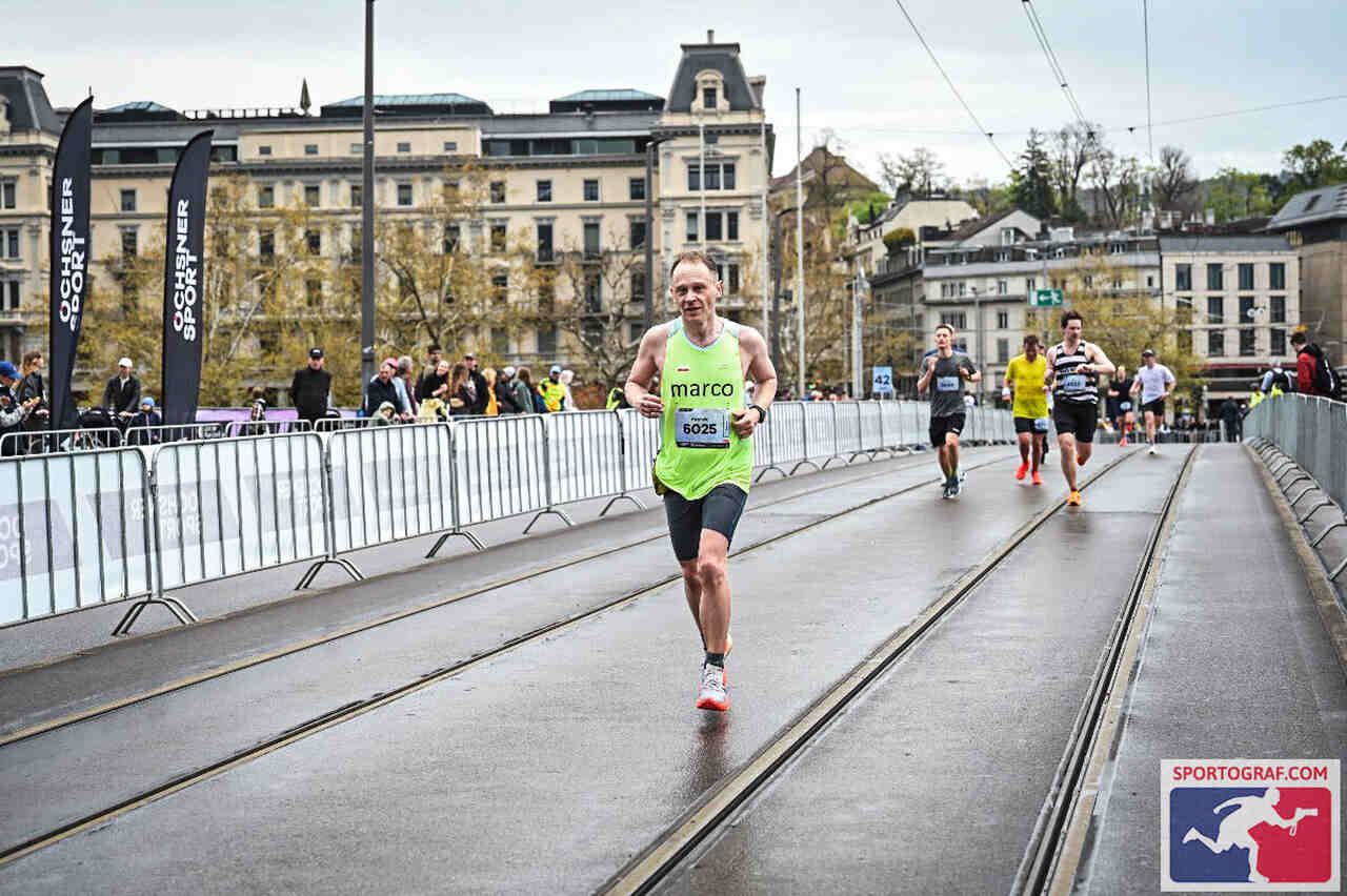 Przed biegiem zakładałem, że jak dotrę trzeci raz do mostu i osiągnę tym samym 36 km to już będzie łatwiej. Faktycznie jest ciekawie bo krążymy znowu po mieście a zaśnieżone szczyty Alp, które towarzyszyły nam w oddali kiedy biegliśmy wzdłuż jeziora są już niewidoczne ale nie jest przez to łatwiej. Snujemy się jak cienie po mokrym, zuryskim asfalcie choć nasze tempo niewiele przekracza 4:20/km Ktoś staje, łapiąc się za udo, ktoś przechodzi przez punkt żywieniowy, dwie osoby, w pół zgięte, są prowadzone/asekurowane przez wolontariuszy. Maratoński standard. Bieg w amoku aby nie stanąć i dociągnąć. Nie było ściany, jeden kilometr po 3:40 a pozostałe po 3:20-kilka. Talstrasse, w kierunku dworca głównego, rytmiczna muzyka przypomina, że Zurych uważa się za stolicę techno. Rytm pomaga, doping pomaga. Znów przed mostem. Tumult, krzyk spikera, tory tramwajowe ale jeszcze nie teraz. Znowu na starówkę. Trzeba jeszcze obiec kościół Fraukirche, po bruku. I wzdłuż rzeki, ostatni kilometr, most, grymas na twarzy, grymas na zdjęciu.
