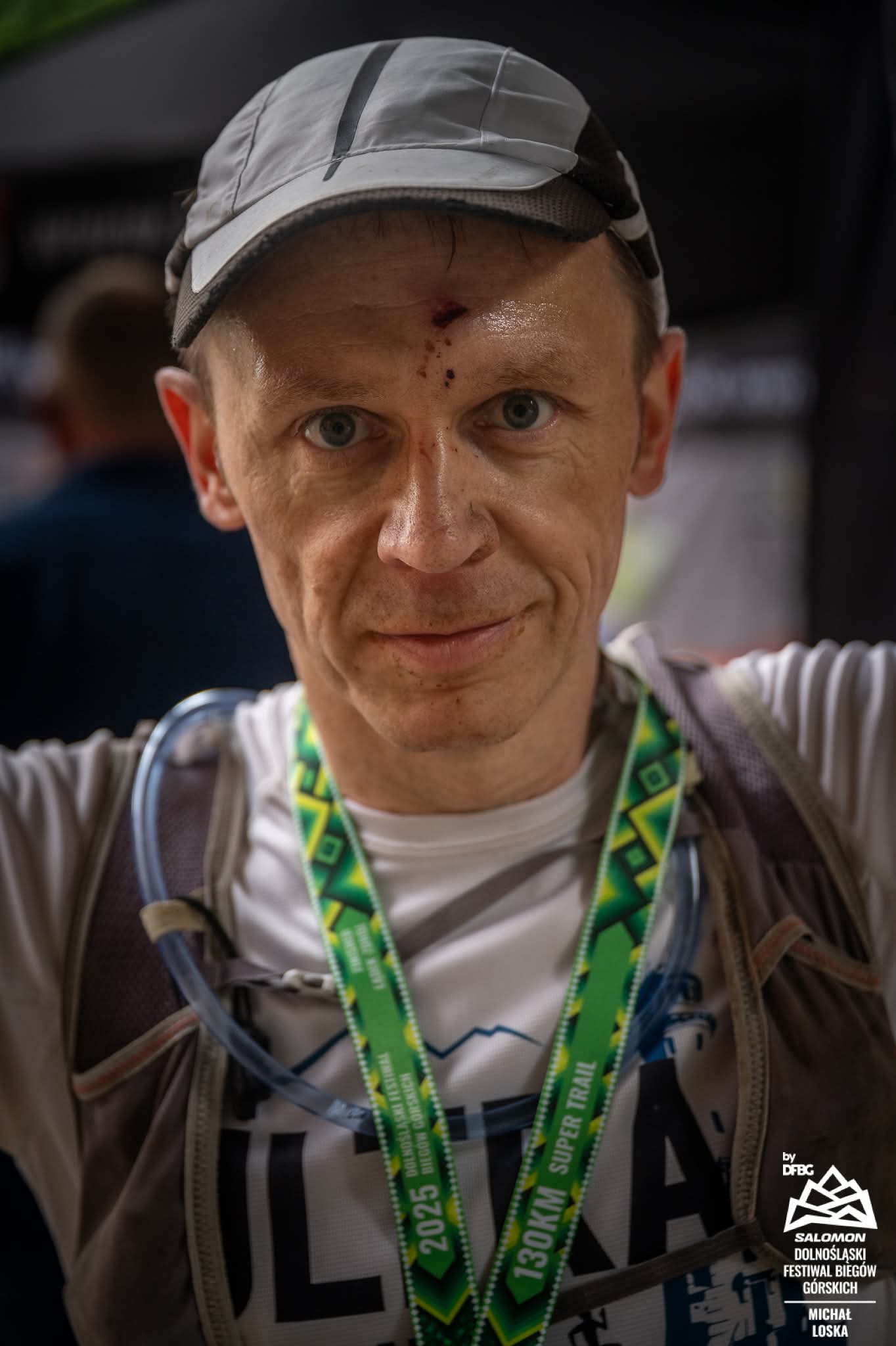 chwilę po asfalcie i „nurkuję” w ciemny las, pośród niskich gałęzi. Wkrótce wychodzę z boru, wątłe światło księżyca, wieża i pojedyncze światełko czołówki w oddali. Przede mną opuszczała punkt dziewczyna. Pewnie to ona. Będzie dla mnie „punktem odniesienia”. Ona i kolejny punkt odżywczy, który już za niespełna 16 km. „Oby do świtu”- wzdycha biegacz, którego mijam po drodze. A więc jeszcze ze dwie, dwie i pół godziny. Z powrotem w lesie, na początku na szerokim ale dziurawym asfalcie. W dziurach woda a wszystko spowite bardzo gęstą mgłą. Ale czuję się zaskakująco „świeżo” i dobrze. To mój najlepszy odcinek trasy. Biegnę a gdy asfalt zmienia się w żwir snujący się wciąż w górę, raźno wbijam weń kije. Zamach za zamachem, krok za krokiem. Przede mną nikogo, za mną „sznur” światełek. Wytyczam drogę na wzniesieniach Gór Bystrzyckich ! Wzgórza: Jagodna (985) i Sasanka. Nie ma korzeni ani raptownych zbiegów. Jest miarowa praca na szerokiej, żwirowej drodze. Przejaśnia się, droga łagodnie opada w dół. Zbiegam żywo aż do wiaty w Spalonej. Tu już jest zupełnie jasno i ktoś wreszcie poważnie traktuje moją ran(k)ę na czole. Człowiek z Biegu Rzeźnika idzie do samochodu po prywatny żel na rany i podarowuje go mnie z instrukcją abym smarował kilka razy dziennie. Dziękuję ! Uzupełniam kalorie ciepłym posiłkiem (darujcie ale już nie pamiętam co to było) i ruszam. Jest 83 km, prawie 5 rano a ja wiem, że ukończę te zawody ! Choć teraz zaczynają się bóle mięśniowe. Idę więc przez las, omijając liczne kałuże. Słońce powoli podnosi się nad horyzont. To najlepsza pora dnia na ultra. Jesteś niemal sam na sam z przyrodą. Odległości są spore. Nie musisz, nie chcesz i nie możesz (bo nie jesteś w stanie) się spieszyć. Oddychasz, chłoniesz, podziwiasz, ekscytujesz się i...mylisz trasę ;) Mimo, że masz włączonego tracka ! Ale ale chwilę wcześniej wyprzedziłeś dziewczynę, której teraz nie widać, ona skręciła prawidłowo. I nic nie powiedziała ? Czy tak się zachowuje na biegu ultra ? Z przeciwka wraca inny uczestnik. On też „przestrzelił” i jemu też nikt nie powiedział. Nadłożyłem jakieś 300 metrów (+300 z powrotem). On więcej. Podążamy razem przez las i pole, trochę podbiegając. To dobry czas na rozmowę. On ma fioletowy numer, przemierza 240 km. Ma wyliczone jak bezpiecznie zmieścić się w limicie czasu. To ważne, 2/3 startujących na tym dystansie nie kończy zawodów...a jesteśmy przecież po doświadczeniach minionej nocy. Wychodzimy z lasu na asfalt. Odcinek ma prawie 20 km ale nie jest zbyt stromy. Próbuję przetłumaczyć udom, że jest „łatwo” i za chwilę osiągniemy setny kilometr. Na końcu odcinka jest jednak poważne wejście do Zieleńca (900 m)w Górach Orlickich. Po asfalcie. Ostatkiem sił się tam wdrapuję. Kolega jest nieco z przodu. Przed nami potężny budynek noclegowy przy stoku. I punkt żywieniowy. Mam kryzys. Nie mogę ustać a jak usiądę ciężko mi wstać. „Ryż z jabłkiem czy pieczony ziemniak ?” Wybieram ziemniaka żeby nie ryzykować. Jacek Deneka dostrzegł mój „znój” i dziur(k)ę na czole i fotografuje z różnych kątów. Dziewczyny z punktu pytają czy rezygnuję. Ja ? Jak to ? Po 103 km miałbym rezygnować ? Co wy ? Gdy obejrzę później zdjęcia będę wiedział dlaczego pytały...Ruszam, jeszcze trochę brakuje do szczytu wzgórza i wyciągu. Obok pasące się bydło i drewno rzucone w nieładzie. Fotograf prosi, żeby przejść koło niego dla efektu.