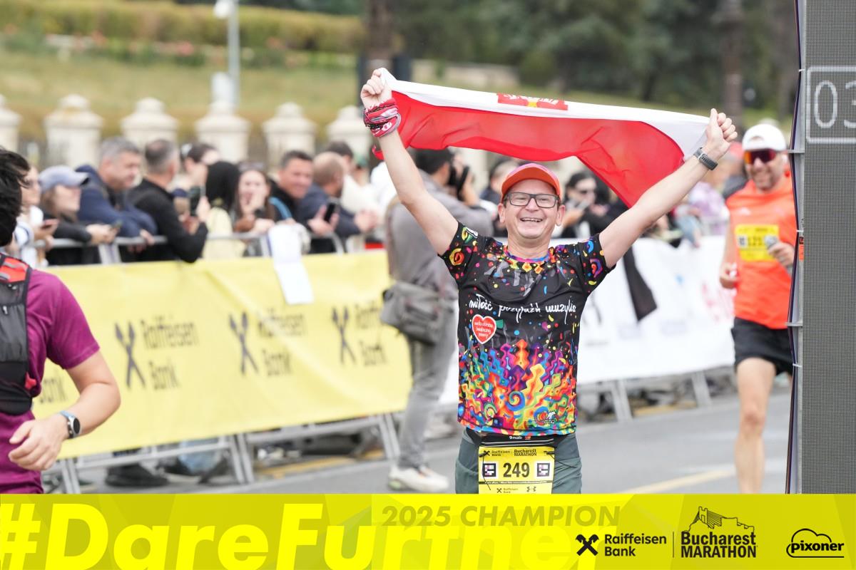 5:00 – 5:10 min./km. Przez większą część zawodów udało mi się biec zgodnie z tym założeniem, a niektóre kilometry pokonałem nawet szybciej, czyli poniżej 5:00 min./km. Na trasie znajdowały się odcinki, gdzie zawodnicy biegli przeciwległym pasem drogi, więc można było pozdrawiać innych zawodników i wypatrywać Polaków, a tych, zgodnie z informacją na stronie wyników było 29 😊 Zgodnie z opiniami maraton faktycznie był płaski. Wprawdzie było kilka niewielkich podbiegów, ale ich nachylenie nie miało raczej wpływu na tempo, a poza tym po chwili zmieniały się one w lekkie zbiegi, co pozwalało przyspieszyć lub po prostu odpocząć. Na 10 kilometrze, czyli w okolicy Łuku Triumfalnego, przy którym była zawrotka zażyłem profilaktycznie ibuprom. Kolejny zażyłem na ok. 30 kilometrze. Punkty odżywcze z wodą, izotonikiem i owocami znajdowały się na trasie co ok. 5 kilometrów. Ze względu na to, że na trasie nie było tłoku, to działały one bardzo sprawnie. Można było wybierać od którego wolontariusza brać kubek 😉 Na 30 kilometrze zacząłem odczuwać już zmęczenie i ból nóg, a moje tempo delikatnie spadło. Postanowiłem jednak powalczyć o dobry wynik i nie pozwolić na to, żeby spadało bardziej. Jak postanowiłem, tak zrobiłem, a pomagała w tym swoim kibicowaniem Ania, która jak zwykle uwijała się po całym mieście, żeby mnie dopingować. Oprócz startu i mety kibicowała mi jeszcze na 1, 5, 12, 14, 17, 18, 20, 23, 26, 30 i 34 km 😊 Na 36 kilometrze ostatni nawrót i długa prosta do samej mety, z jednym tylko zakrętem przed metą. Końcówka trasy to bieg Bulevardul Unili, ulicą zwaną bukaresztańskimi „Polami Elizejskimi”. Miejsce to maraton pokonywał 4-krotnie. Na ostatnich 2 kilometrach przyspieszyłem, bo chciałem ukończyć te zawody w czasie poniżej 3:40:00 😊 Pod Parlamentem finiszowałem szczęśliwy i zadowolony z osiągniętego rezultatu oraz przebiegu tych zawodów 😊 Jeśli chodzi o kibiców, to na trasie nie było ich bardzo dużo. Pojedyncze osoby i małe grupki, a także kilka zorganizowanych stref kibica. Najwięcej rzecz jasna było ich w okolicy startu i mety. W tych zawodach osiągnąłem najlepszy rezultat maratoński w tym roku. A właściwie to od 2023r. od maratonu w Zurychu 😊 Z czasem 3:38:41 na 1285 startujących w maratonie osób zająłem 369 miejsce, w kategorii wiekowej na 245 osób zająłem 69 miejsce, a w kategorii płci na 1084 osób zająłem 333 miejsce. Wśród 29 Polaków uplasowałem się na 8 pozycji. W tym samym czasie na trasie biegło jeszcze 2072 półmaratończyków i 137 sztafet maratońskich. Dzień wcześniej odbywał się także bieg na 10 km, w którym wystartowało 3269 osób. Podsumowując zawody i pobyt w Bukareszcie, to jak najbardziej zachęcam wybrać się tam i pobiegać. Miasto jest dość interesujące, a maraton odpowiedni na osiąganie dobrych rezultatów. Sporą ilość zakrętów
