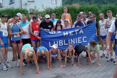 W ramach biegu odbywały się Mistrzostwa Klubu WKB META Lubliniec w biegu górskim, na lokalizację których nie bez przyczyny zostało wybrane właśnie to miejsce - Góra Żar. Malownicze tereny oraz trasa, dobre zaplecze i wspaniała współpraca z Organizatorem biegu panem Kazimierzem Hojdysem dawały gwarancję udanej imprezy. Klub ściągnął z całym majdanem pakując do autobusu całe rodziny niejednokrotnie wraz z dziećmi i żywym inwentarzem… Baza wypadowo-noclegowa znajdowała się niedaleko startu w Domu Strażaka gdzie dzięki uprzejmości właściciela pana Krzysztofa Staszewskiego wzięliśmy pod okupację cały hotel wraz z przylegającymi włościami. Do startu Prezes Rosiński zobowiązał wszystko co tylko umie chodzić pod groźbą nałożenia na migających się kontrybucji. Na starcie pojawiają się wszyscy nawet czworonożny inwentarz, gdyż nie ma taryfy ulgowej dla nikogo. Biegniemy więc na Żar, a żar leje się na nas z góry…. Dobiegamy do początku szlaku gdzie stawka nieco się stabilizuje i coraz częściej trzeba przechodzić do marszu gdyż szybki marsz wydaje się bardziej ekonomiczną forma wspinaczki niż wolny trucht. Mija mnie Łukasz z Karoliną, a później nasz biały Etiopczyk Heniek. Łukaszowi nie „leżą” jednak góry więc obowiązki obstawy naszej „Pchełki” przyjmuję na siebie. O ile jeszcze pod górkę daję rady dotrzymać jej kroku, tak z górki pchełka jak to pchełka z kamyczka na kamyk i już jest 10 metrów z przodu. Presja jest jednak duża, Karolina wie, że jest na miejscu drugim lecz gdzieś tam niedaleko za nami biegnie pani Irena Czuta Pakosz, a to przeciwnik pierwszej klasy. Karolina jednak wytrzymuje do samej mety wykazując się pięknym, mocnym finiszem, na którym wyprzedza mnie o całe 2 sekundy. Dumni jesteśmy i pełni podziwu dla tej małej „Pchełki”, w której podobnie jak w dżemie - tyle siły dżemie... ;)