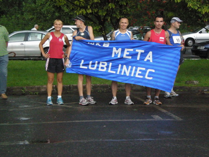 Nie lubię upałów ale też nie znoszę chlupotania wody w butach i tego uczucia zsuwających się skarpetek gdzieś w głąb buta, tak jakby i one chciały się ukryć przed deszczem. Tak jak pozostali moi towarzysze gnieciemy się pod małym zadaszeniem bijąc chyba pod tym względem zaludnienie Tokio o głowę (lub o kilka głów nawet). Gdyby nie Diana stojąca w naszym męskim gronie można by odebrać te nasze „ściskanie się” jako zgoła niemoralne… :). Nikt nie zwracał jednak na to uwagi gdy tak deszcz ewoluował na naszych oczach od ulewy poprzez różne rodzaje rzęsistości i wydajności na m2. Na 2 minuty przed startem zjawiają się pierwsi śmiałkowie wykorzystując złudną osłonę nadmuchanej bramy jako osłonę przed i tak nieuniknionym. Zaraz po starcie moje wołanie z prośbą o nie chlapanie na boki zostaje nie wiem dlaczego zupełnie zignorowane więc już się nie odzywam aż do 4 km kiedy to zauważam przed sobą Szafara, który jak przypuszczam stara się mnie dogonić. Informuję go, że już nie musi tak gonić gdyż jestem tuż za nim. Dotrzymałbym towarzystwa ale w oddali zobaczyłem naszego farmaceutę Stasiarka więc chciałem zagadać co w świecie słychać. Słychać pewnie i było wiele tyle tylko, że Stasiar połączony siecią przewodów będących zapewnie aparatem słuchowym (gdyż za nic nie słyszał co do niego mówię) znacznie utrudniającym wymianę zdań przy i tak ciężkiej zadyszce. Zresztą trudno się dziwić, że wyjątkowo mało konwersacji było słychać na trasie, częściej są to tylko krótkie słowa lub gesty pozdrowień. Przy okazji słowa podziękowania dla Treborusa za doping choć do teraz zachodzę w głowę jak można widniejący na jego koszulce napis „Żeszuf” jeszcze bardziej zepsuć? (co zrobić z tym cholernie poprawnym „sz”??) ;))