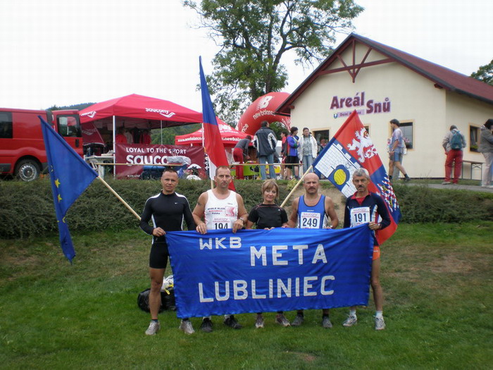 Od samego rana towarzyszy nam niemiłosierny upał sprawiający, że nawet łatwiejsze technicznie odcinki trasy stwarzają sporo problemów i kosztują wiele wysiłku. Szczególnie widok prawie pionowej ściany podbiegu pod stok narciarski odbiera mi siły i wolę walki ale starając się nie patrzeć w górę jakoś docieram do miejsca gdzie szlak schodzi trawersem i można teraz z niemałą satysfakcją z góry oglądać tych co dopiero podchodzą potykając się o własne wywieszone języki. Ostatnie pół kilometra oznaczone co 100 metrów, wiodące nieosłoniętym skalistym szczytem Slamnika zdaje się nie mieć końca. Mijam kobietę leżącą na skraju trasy, której medycy udzielają pomocy, oraz starszego prawie omdlałego zawodnika prowadzonego pod ręce przez innych zawodników. Upał i trudy trasy zbierają dzisiaj swoje żniwo. Sam na mecie nie potrafię złapać oddechu i muszę na chwilę położyć się wprost na kamieniach by dojść do siebie. Ku mojemu zmartwieniu na mecie nie ma ani kropli wody (!) co zdaje mi się wręcz nierealne. Schodzę kolejne 500 metrów w dół gdzie czekają na mnie już koledzy ale i tu dowiaduję się, że nie ma nic do picia, a woda, która do niedawna jeszcze tutaj była w jednym pojemniku przypominała bardziej deszczówkę niż wodę do picia, a i tak podobno nabierano ją podniesionymi z ziemi używanymi kubkami i spożywano.. Pierwszy raz na jakichkolwiek zawodach zabrakło mi wody na mecie, a przy tej randze zawodów taki błąd jest wręcz niedopuszczalny. Jak się później dowiedzieliśmy od Andrzeja Puchacza, punkt odżywczy z napojami, odżywkami i jedzeniem znajdował się poniżej miejsca skąd zawodników odwoziły podstawione busy z powrotem do wsi. Fakt, błąd tkwił i po naszej stronie gdyż nie doinformowaliśmy się o jego lokalizacji ale usytuowanie go w miejscu innym niż miejsce podstawienia busów było wielce niefortunne. Stąd też Andrzej relacjonując całe zajście stwierdził, że na punkcie wszystkiego zostało w bród co świadczy wymownie o tym, że wielu zawodników po prostu z niego nie skorzystało. No ale jak mawia mój stary przyjaciel „trzeba czytać, czytać i jeszcze raz czytać i to ze zrozumieniem”. Czekamy więc na pozostałą naszą parę, Zbyszek – Mariola, którzy startowali jako ostatnia grupa. Celowo napisałem „para” gdyż upał nie służy dzisiaj Marioli i Zbyszek holuje ją za rękę, co gdyby nie okoliczności i wyjątkowy pośpiech odebrać by można wielce dwuznacznie (chociaż warto by się temu przyjrzeć). Po karkołomnym zjeździe „szalonym” busem na dół serwujemy sobie guláš s knedlami i ryzí pivo z hor, zastanawiając się co też może oznaczać to słowo „ryzí” ?. Że niby co? ryże, z ryżu czy co?. Nikomu nie przyszło na myśl, że chodzi tutaj o „Świeże piwo z gór” , a nie o ryżego górala z piwem, ale warto wiedzieć więcej..