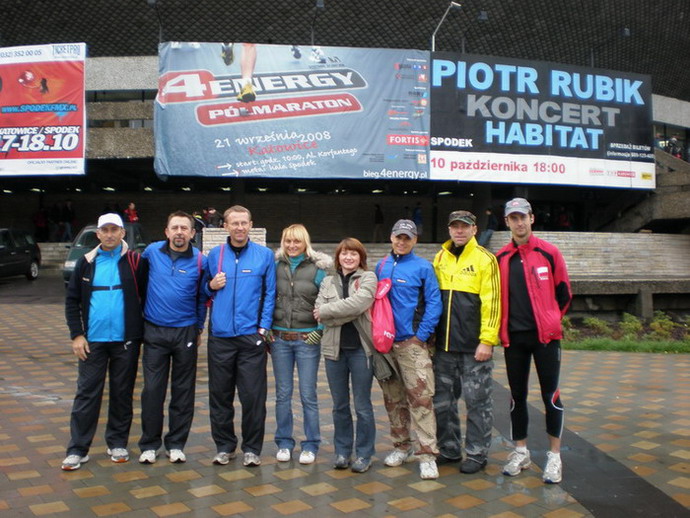 Sprawy „biurowe” załatwiamy w Spodku bardzo szybko, tym bardziej, że nasz katowicki rezydent Stasiar odebrał dla nas wcześniej pakiety startowe od kierownika biura zawodów z ramienia Organizatora – Alka. Zanim się z każdym zdążyliśmy przywitać i zamienić kilka słów już trzeba było się przebierać i stawać na linii startu. Trasa to 3 pętle o długości 7 km Start z Al. Korfantego, następnie przez rondo, rynek i dalej ulicami Katowic, wspinając się lekkim podbiegiem prawie połowę pętli, aby później po nawrocie pomykać w dół z powrotem w kierunku Spodka. Nasze dziewczyny Diana i Lidka mają do pokonania jedną pętlę i zadanie: nie dać się zdublować!. Zapewnienia, że będzie to dla mnie wyścig pokoju czyli dłuższe rozbieganie biorą w łeb zaraz po tym jak Diana niczym sarenka oddaliła się znacznie, stwarzając tym samym okazję do pościgu. Później gdzieś tam zobaczyłem Szafara, Stasiara i tak się to zaczyna pokojowo, a kończy jak zwykle. Podobają mi się te wzajemne mijanki na trasie gdyż można obserwować zarówno czołówkę w akcji jak i pozycję swoich konkurentów. Mniej już podobają mi się te podbiegi i jedynie myśl o czekającym zbiegu powoduje, że są nieco lżej strawne. Meta mieści się w Hali Spodka, gdzie migające lampy stroboskopowe i aplauz zgromadzonych kibiców robią niesamowite wrażenie. Po minięciu linii mety i otrzymaniu pamiątkowego medalu, sam zasiadam na widowni i przyglądam się chwilę jak to wszystko wygląda z tej drugiej strony. Muszę przyznać, że imponująco, świetny pomysł z tym zakończeniem w środku Spodka gdzie światła i dźwięk potęgują wrażenie i dodają skrzydeł. Po przebraniu się w suche i ciepłe ubrania udajemy się do bufetu gdzie serwują nam żurek z kiełbasą, który to nie zyskuje wysokich notowań u Zbyszka przyzwyczajonego do niedzielnej wyżerki z kluchami i roladą. Nieco pokrzepieni nabieramy ochoty na małe co nieco w kawiarni „Pod Spodkiem”. W atmosferze półmroku przy płonących świecach spotykamy się całą niemal paczką i przy kawie, niezliczonej liczbie herbat i „innych” napojów spędzamy miło czas w oczekiwaniu na ceremonię wręczenia nagród zwycięzcom. Dla nas dzisiaj ważniejsze jest losowanie atrakcyjnych nagród wśród wszystkich startujących, a jest na co czekać. Wśród nagród m.in. 42” telewizor LCD; aparaty fotograficzne; monitory LCD i sprzęt sportowy. Każdy siedzi i miętosi swój numer startowy niczym chłop kapelusz na sumie. Zgłaszając się można było samemu wybrać własny, szczęśliwy numer startowy i teraz nadeszła chwila aby o tej magii cyfr się przekonać czy działa. Niespodziewanie spiker wypowiada moje szczęśliwe cyfry, które sam sobie wybrałem!. Zaskoczenie i radość towarzyszą mi w drodze na środek areny gdzie odbywa się wręczenie nagród. Odbieram aparat cyfrowy, wart swoich 8 Mega Pixeli, lecz to spojrzenie kolegów – bezcenne ;)