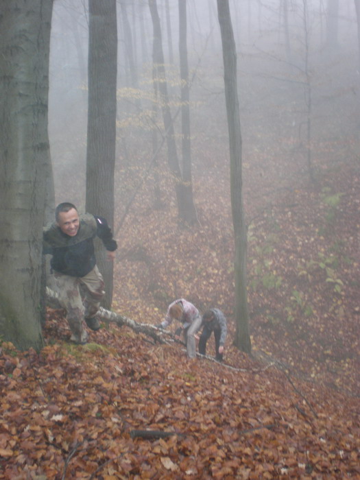Start biegu to też temat do niejednej rozprawy na temat jak nie należy postępować. Puszczając dzieciaki razem z dorosłymi ze wspólnego startu należało się liczyć, było pewne, że dojdzie do wielu przykrych zdarzeń. Na dodatek dzieciaki wyrwały z pierwszego rzędu, a tam po starcie trasa w dół, szybkość spora, co chwila jakiś dzieciak wypadał z trasy, a po kilkuset metrach co rusz nagle wpadałeś na idącego malucha.. Początek to jedna wielka przepychanko-mijanka, w której niestety najbardziej cierpieli ci słabsi i wolniejsi. Trasa to niezły karkołomny anglosas wiodący wąskimi ścieżkami usłanymi mokrym dywanem liści ukrywającym położone pod nimi korzenie i liczne dziury. Karkołomne zbiegi, na których niektórzy zjeżdżają ślizgając się obunóż niczym na nartach. Istne wariactwo. Podbiegi weryfikują nieco „ślizgaczy” bo tutaj raczej jodełką pod górkę trzeba.. Spoglądam na zegarek. O ile podany dystans 5 km jest właściwy to powinna być zaraz meta. Może za tym zakrętem? Nie.. może za następnym? Też nie, coś za cicho! Cholera gdzie jest ta meta! Wreszcie jest, wpadamy na dziedziniec u podnóża Kopca Kościuszki, gdzie na mecie osobno, na prawo panie, na lewo panowie. Gorąca grochówka i herbata rozgrzewają czas oczekiwania na dekorację zarówno w kategorii open jak i w kategoriach wiekowych. Na 3 stopniu podium staje Adam Markowski w swojej kategorii, rewanżując się tym samym za słabszy występ w dniu wczorajszym. Zakończenie szybko i sprawnie, gorzej z powrotem do miejsca pozostawienia samochodu. Niestety organizator nie zapewnił żadnego transportu dla takich jak my i niestety musimy pokonać całą trasę raz jeszcze z tą tylko różnicą, że w przeciwnym kierunku. Na szczęście są taśmy więc spoko.. Po kilometrze z przerażeniem zauważamy chłopaków, którzy zwijają taśmy tuż u samego wejścia do zasnutego mgłą lasu… Wiedźma powróciła.…