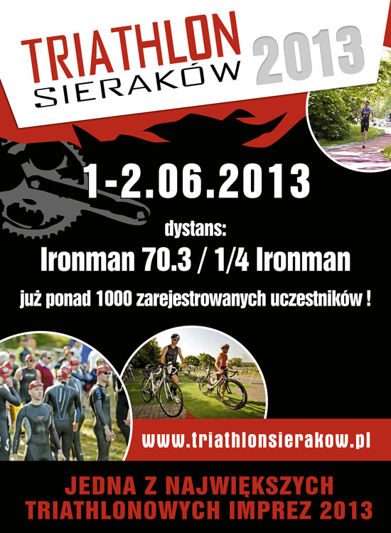 Triathlon Sieraków 2013 to dwudniowy festiwal triathlonowy, gdzie zmierzyć się będziecie mogli na dystansie długim (1900m/90km/21,1km) 1 czerwca oraz krótkim (950m/45km/10,55km) 2 czerwca, a wszystkie Dzieci czeka Mini Triathlon Sieraków również 2 czerwca!