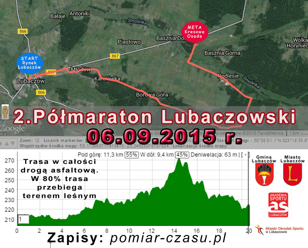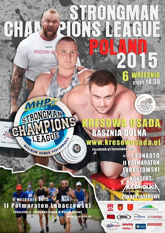 Druga edycja lubaczowskiego półmaratonu. Trasa; Lubaczów - Basznia Dolna (Kresowa Osada), po drodze asfaltowej, większo¶ć trasy przebiega lasem. Zapisy: http://www.pomiar-czasu.pl/zawody.php?nr=z150906 Tego dnia w Kresowej Osadzie odbęd± się również międzynarodowe zawody z cyklu CHAMPIONS LEAGUE STRONG MAN 2015. Jedyne zawody cyklu Ligii Strongman w Polsce. Liga Strongman rozgrywana jest w 18 krajach na całym ¶wiecie. Zawody będ± transmitowane do 89 krajów przez EUROSPORT. O go 21:00 koncert zespołu Alcoholica - Metallica Cover Band